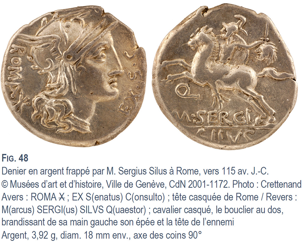 Le revers du denier frappé par Marcus Sergius Silus (FIG. 48) commémore les faits d’armes de son aïeul homonyme, soldat illustre de la République dont les mésaventures sont décrites par Pline l’Ancien dans son Histoire naturelle :