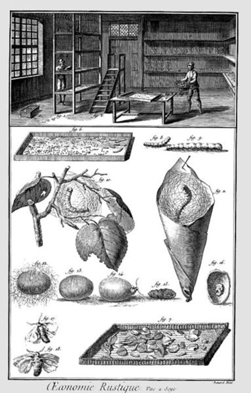Source : ‘Oeconomie rustique’ in Diderot, Denis, D’Alembert Jean Le Rond, Encyclopédie ou dictionnaire raisonné des sciences, 23, « Agriculture » 1751-1780 , wikimedia commons : https://commons.wikimedia.org/wiki/File:Planche_Soie.jpg
