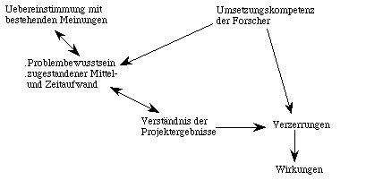 b) Die Uebereinstimmung der Projektresultate mit bestehenden Meinungen, verbunden mit einem hohen Problembewusstsein, führt zu einem besseren Verständnis der Projektresultate und somit zu einem Minimum an Verzerrungen. Ist dies nicht der Fall, dann besteht die Gefahr, dass die Projektresultate verzerrt und zu opportunistischen Zwecken missbraucht werden.
