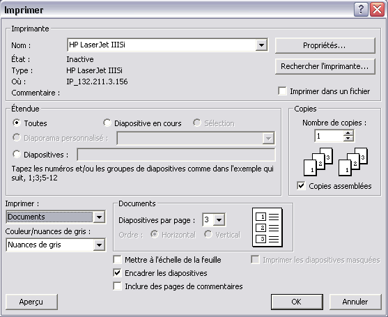 Par défaut, le menu déroulant Imprimer indique Diapositives, cela signifie que chaque diapositive sera imprimée sur une pleine page. On peut aussi sélectionner Page de Commentaires ou Mode Plan selon le mode d'affichage avec lequel on travaille. L'option Documents permet de choisir combien de diapositives seront imprimées sur chaque page. Dans le menu déroulant Diapositives par page, choisir le nombre de diapositives, de 1 à 9 puis le sens de la lecture : Horizontal place les diapositives en ordre de lecture sous forme de Z, Vertical sous forme de N. Choisir trois diapositives par page imprime des lignes à la droite de chaque diapositive permettant d'inscrire des commentaires à la main une fois le document imprimé. Les trois cases à cocher proposent de mettre à l'échelle de la feuille (les diapositives), d'encadrer les diapositives (conseillé lorsqu'il y a plusieurs diapositives par page), d'inclure des pages de commentaires." Source : HEC Montréal.
