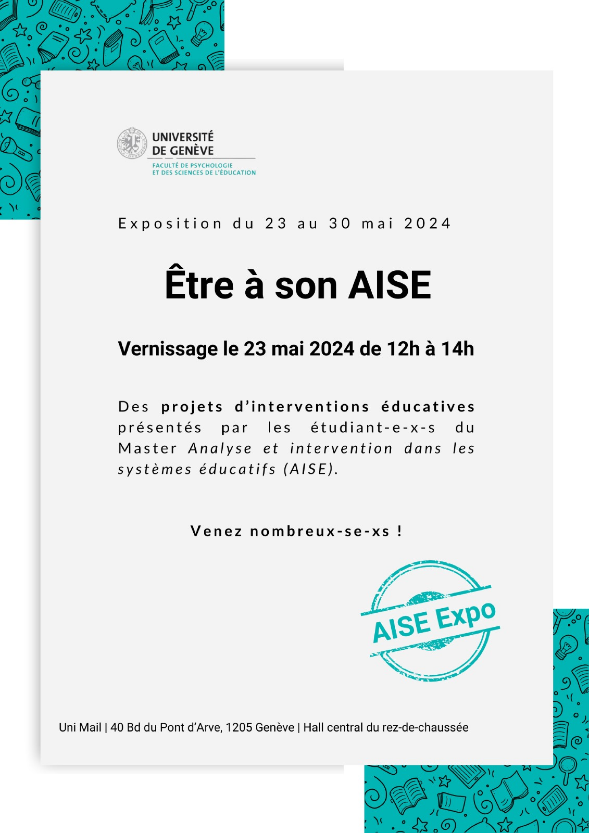 Avant la fin du semestre de printemps, nous, les étudiant-e-x-s du Master en sciences de l’éducation, Analyse et Intervention dans les Systèmes Éducatifs (AISE), avons le plaisir de vous convier à notre exposition :