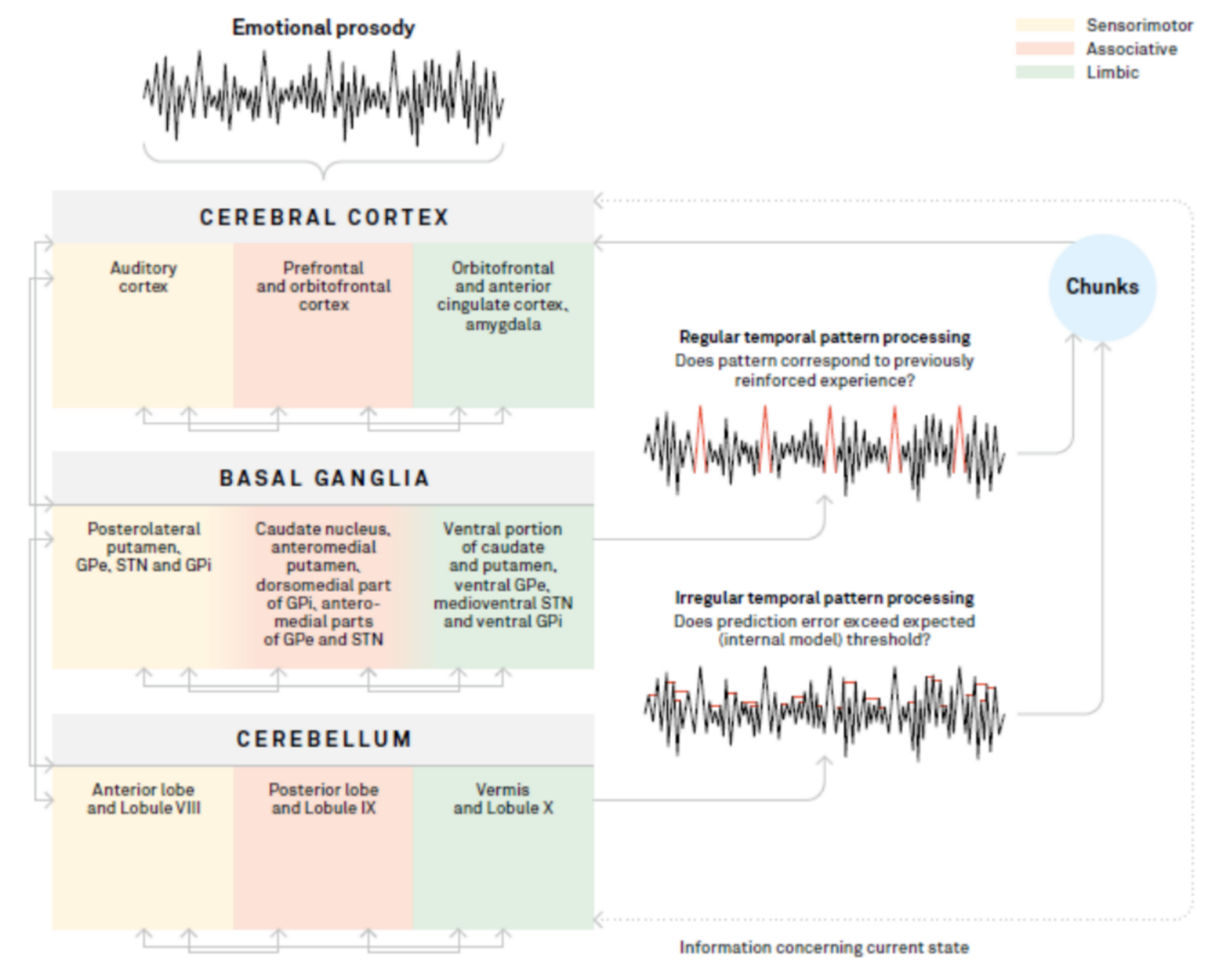 Integrated model of emotional prosody processing. An emotional prosodic stimulus is processed by the cortex, the basal ganglia, and the cerebellum. Each sensorimotor (yellow), associative (orange), and limbic (green) region of each structure takes part in this processing. The functional gradient present for the basal ganglia is represented by the overlapping colors. The basal ganglia and the cerebellum are involved in different temporal pattern processing. The basal ganglia process regular temporal patterns in order to detect global similarity with previous responses to what was previously rewarded. The cerebellum processes irregular temporal patterns to detect the fine variations that possibly deviate from what is tolerated in terms of a response in relation to the individual's current state. The chunking process is elaborated by the basal ganglia if emotional sequences are recurrent, as induced by a triggered stimulus (internal or external), and, once started, it may come to an end without conscious control. Chunks are also refined by the cerebellum to gain precision so that the basal ganglia can activate downstream regions more quickly to generate a response. Abbreviations: GPe: external globus pallidus; GPi: internal globus pallidus; STN: subthalamic nucleus.