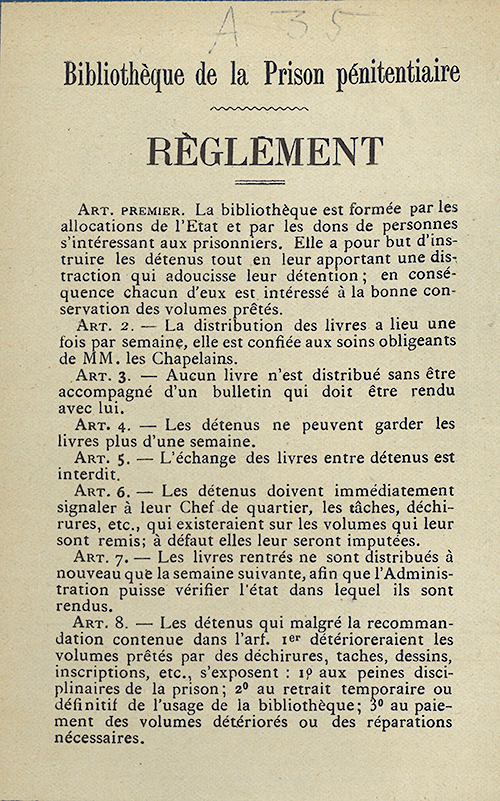 Règlement de la bibliothèque de la prison collé sur un ouvrage provenant de la Prison pénitentiaire de Genève.