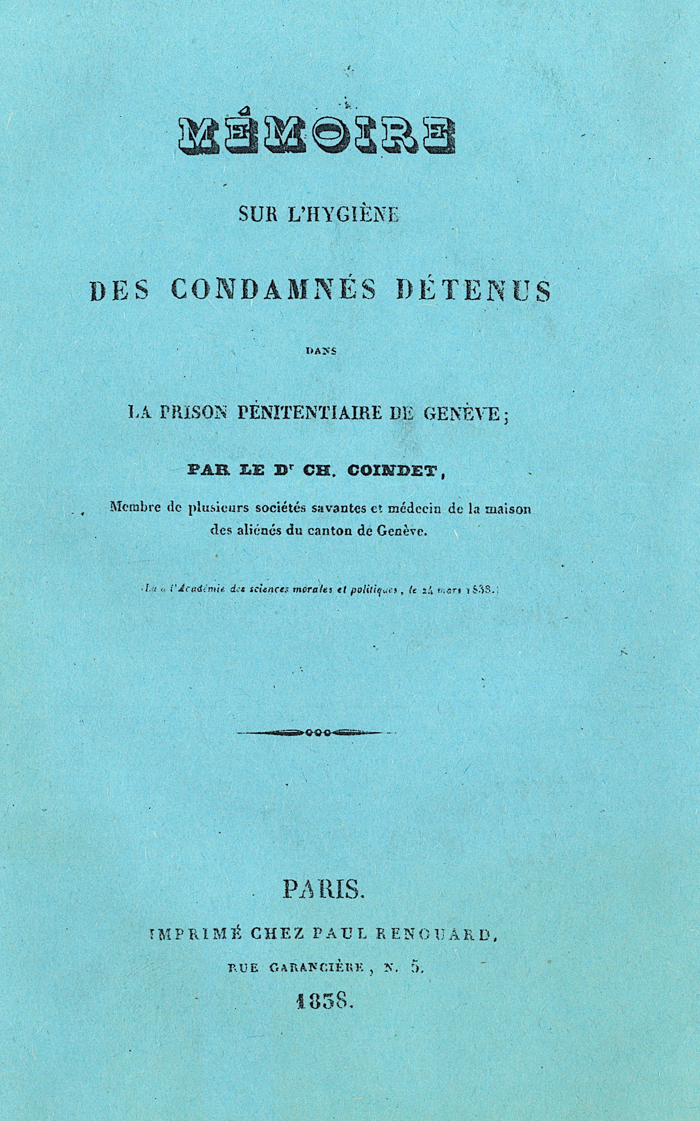 Dr. Charles Coindet (médecin de la Maison des aliénés du canton de Genève), Mémoire sur l’hygiène des condamnés détenus dans la Prison pénitentiaire de Genève (1838).