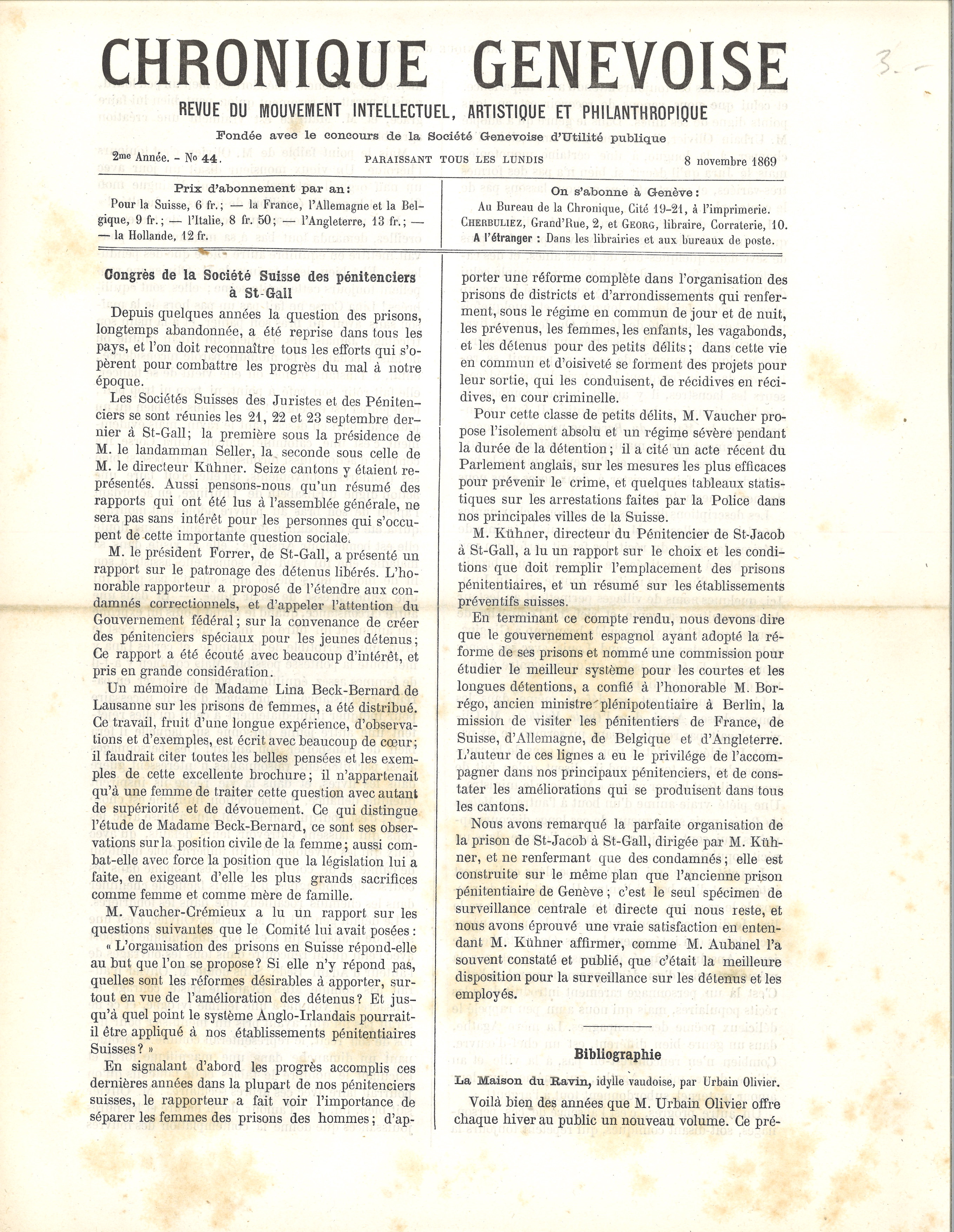 Chronique genevoise. Revue du mouvement intellectuel, artistique et philanthropique. Fondée avec le concours de la Société genevoise d’utilité publique.