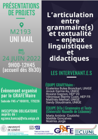 Ce workshop se propose d’approfondir la réflexion menée au sein du projet GRAFE’MAIRE autour de la problématique de l’articulation « grammaire et texte(s) » dans le cadre d’une journée de dialogue avec les membres de l’équipe Gramática & Texto. L’objectif de la journée est d’aborder cette thématique sous l’angle théorique et didactique : que veut dire concrètement « articuler » ? Comment sont impliqués dans les interactions / articulations les différents niveaux d’organisation langagière (du genre textuel au signe linguistique) ? Avec quels exemples (d’objets linguistiques, de mécanismes, etc.) peut-on illustrer clairement des phénomènes d’articulation ? Avec quelles conceptions du texte et de la grammaire ? Comment penser et désigner la différence entre versant linguistique / langagier et versant didactique ? La distinction « interaction » - « articulation » serait-elle pertinente pour distinguer niveau linguistique (fonctionnement effectif des composantes du langage en interaction) et niveau didactique (conception, didactisation, mise en dispositif didactique de l’interaction dans des séquences d’enseignement articulant des composantes du langage) ?