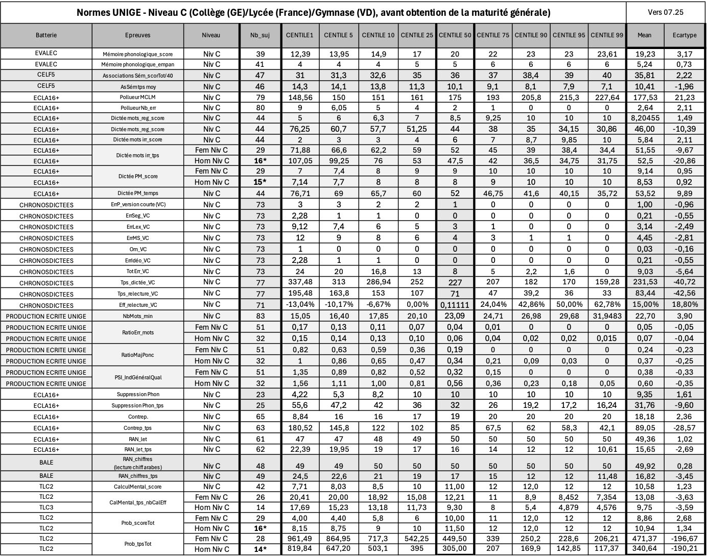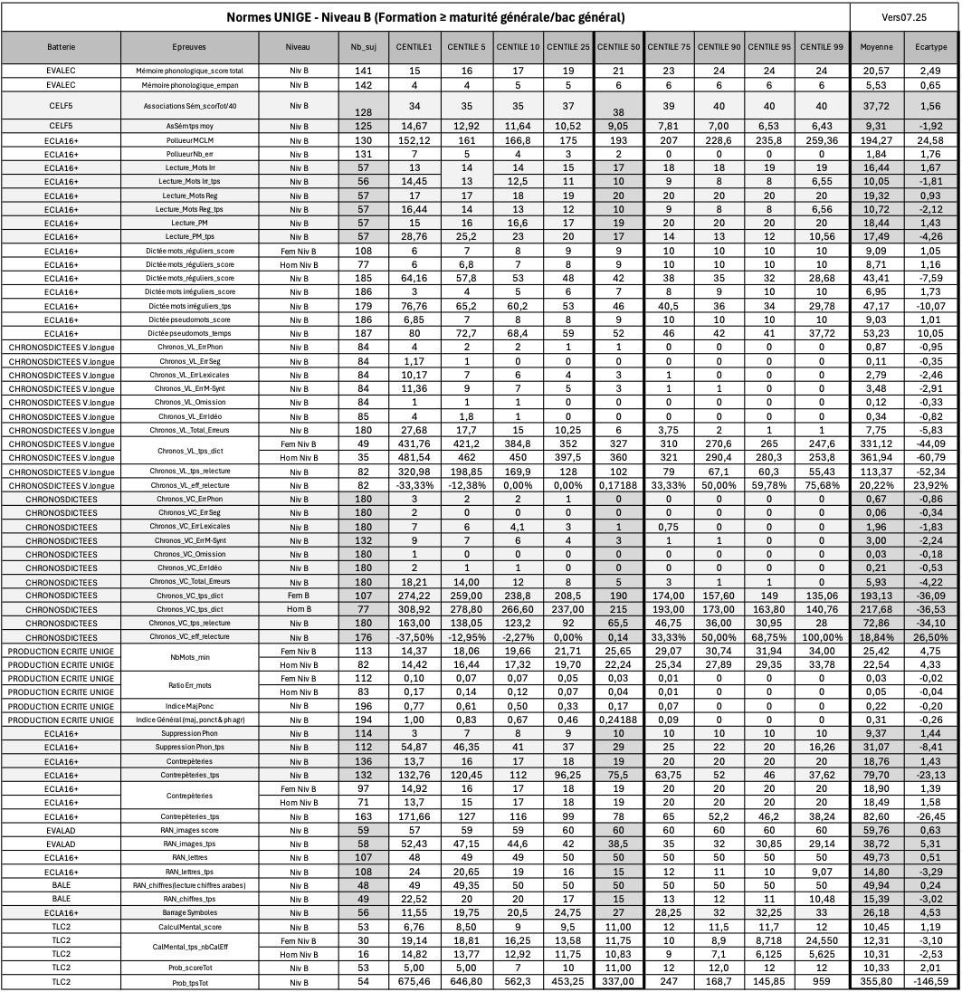 Les données normatives présentées sur cette page ont été récoltées dès 2016 sur une population de jeunes adultes de 16 à 26 ans, en formation ou en emploi, de Suisse romande et de France voisine, pour des batteries d’évaluation existantes et pour une épreuve de production écrite (récit narratif UNIGE, voir consignes de passation et fichier de cotation).