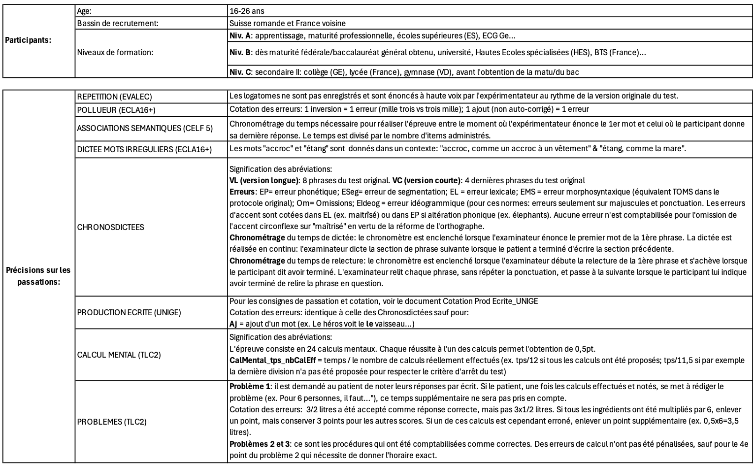 Les passations ont été réalisées par des étudiant-es de Maîtrise en logopédie et ont fait l’objet d’une triple cotation, dont au moins une par une logopédiste expérimentée.