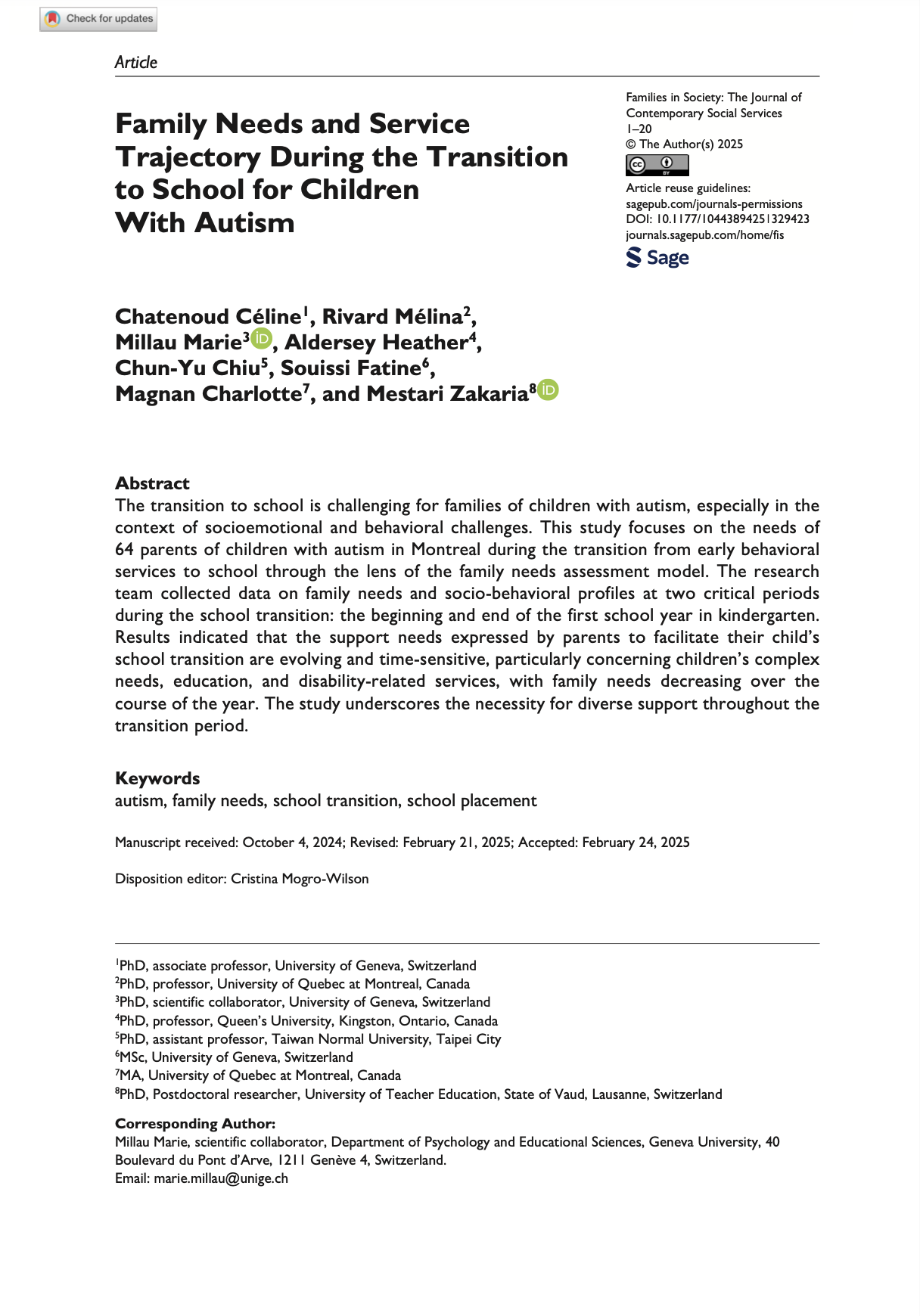 Publication scientifique - Family Needs and Service Trajectory During the Transition to School for Children With Autism