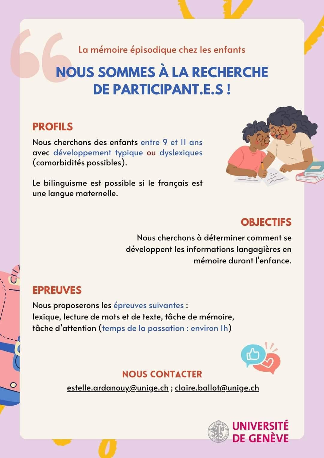 Nous recherchons encore des enfants avec une dyslexie entre 9 et 11 ans, si votre enfant est intéressé, n’hésitez pas à nous contacter ! Téléchargez le Flyer ici