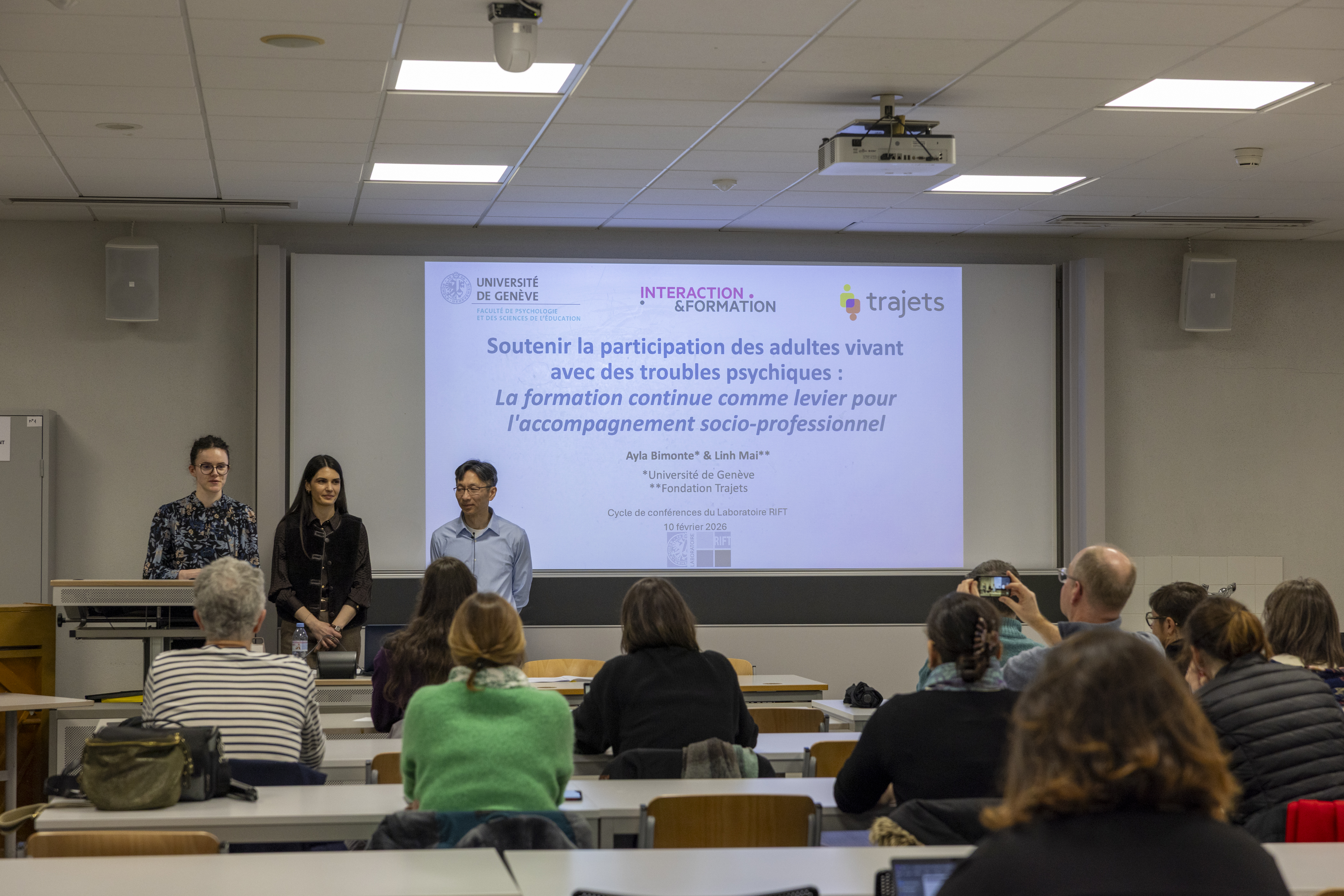Pour suivre le fil-rouge de la participation en formation des adultes, la conférence proposée par Ayla Bimonte (Equipe Interaction & Formation) et Linh Mai (Fondation Trajets) offrait une configuration de participation inédite : celle d’un croisement de regard et d’une réflexion à deux voix sur une question d’une vive actualité : comment des dispositifs de formation continue sont-ils susceptibles de soutenir les apprentissages et le développement dans le champ de l’insertion socio-professionnelle d’adultes vivant avec des troubles psychiques ?
