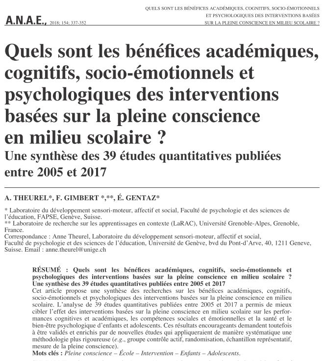 Theurel, A., Gimbert, F., & Gentaz, E. (2018). Quels sont les bénéfices académiques, cognitifs, socio-émotionnels et psychologiques des interventions basées sur la pleine conscience en milieu scolaire ? Une synthèse des 39 études quantitatives publiées entre 2005 et 2017. A.N.A.E, 154, 337-352.