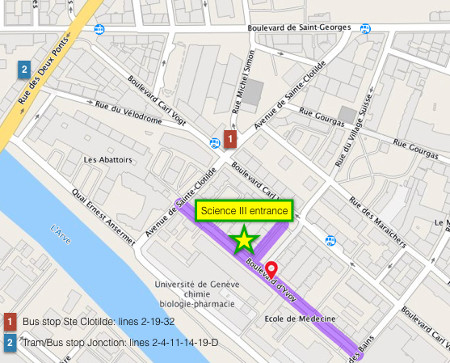 - Tram line 14 direction P+R Bernex, get off at Jonction (2 on the map)