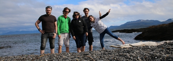 Mardi 16 février 2016 avant le départ du brise-glace Polarstern sur une plage de Punta Arenas, Chili. De gauche à droite: Florian Lelchat (UNIGE), Matthias Sieber (ETHZ), Prof. Christel Hassler (UNIGE), Damien Cabanes (UNIGE) et Sonia Blanco (UNIGE).
