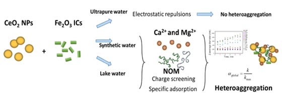 Lorsque des nanoparticules manufacturées sont libérées dans les eaux naturelles, une hétéroagrégation entre les nanoparticules et les composés naturels se produit. Dans ce travail, l'hétéroagrégation entre nanoparticules de CeO2 et des colloïdes inorganiques du type Fe2O3, qui représentent une importante fraction inorganique dans l'eau du lac Léman, est étudiée. Les mécanismes d'hétéroagrégation entre CeO2, Fe2O3 et l'alginate dans plusieurs échantillons d'eau sont étudiés à l'aide de mesures du potentiel zêta et du diamètre hydrodynamique moyen des objets. La cinétique d'hétéroagrégation, quant à elle, est étudiée en utilisant la méthode du Time Resolved DLS. L'efficacité globale d'attachement (αglobal) est calculée en utilisant des données provenant d'expériences cinétiques. αglobal pour les nanoparticules de CeO2 varie de 0,5 à 0,7 dans l’eau du lac et une eau synthétique et se situe autour de 1 pour le Fe2O3 et le mélange CeO2 et Fe2O3. Nos résultats démontrent que l'hétéroagrégation dépend fortement des conditions environnementales et des scénarios électrostatiques correspondants. Aucune hétéroagrégation à pH 8 entre CeO2, Fe2O3 et l'alginate n'est observée dans l'eau ultrapure, en raison des répulsions électrostatiques. Dans l’eau synthétique et l’eau du lac, la situation est opposée. En effet, on constate que l'adsorption spécifique de cations divalents et la présence de sel favorisent l'hétéroagrégation par des effets de pontage et d’écrantage cationiques.