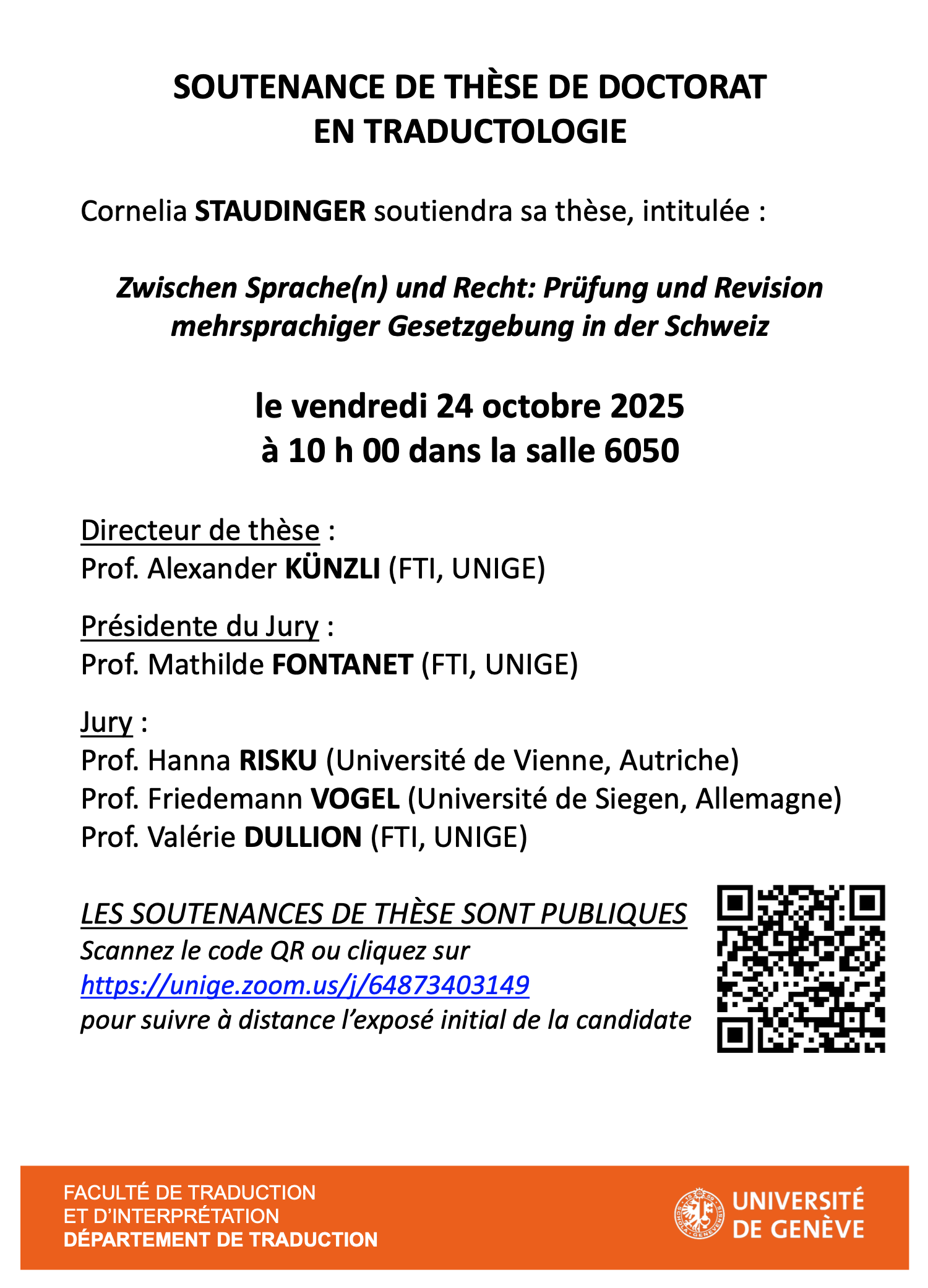 Cornelia STAUDINGER a soutenu, le vendredi 24 octobre 2025, sa thèse de doctorat intitulée : « Zwischen Sprache(n) und Recht: Prüfung und Revision mehrsprachiger Gesetzgebung in der Schweiz». Elle a obtenu la mention « Très honorable avec félicitations du jury ».