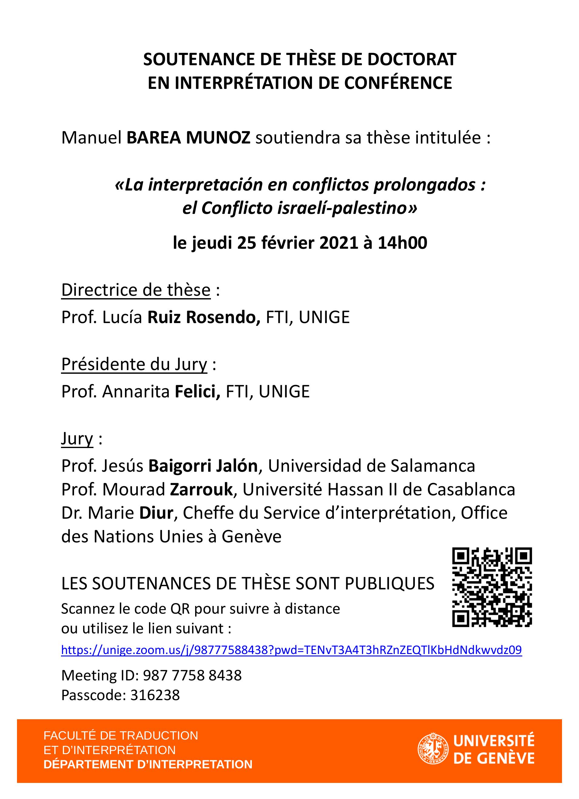 Manuel BAREA MUNOZ a soutenu, le jeudi 25 février 2021, sa thèse intitulée : « La interpretación en conflictos prolongados : el Conflicto israelí-palestino ». Il a obtenu la mention « Très honorable avec les félicitations du jury ».