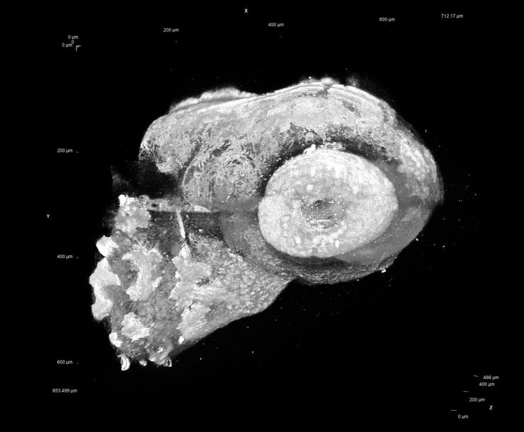 Third harmonic generation image of a zebrafish larvae head excited at 1650 nm (image by Thomas, in collaboration with A. De Simone's group)