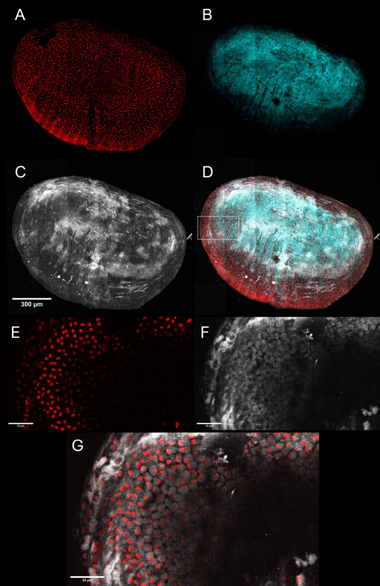 5 days post plucking zebrafish scale imaged upon 1650 nm laser excitation. A, B, C, D z-projection of the whole scale volume (51 frames) A H2A:mCherry 3-photon fluorescence. B SHG. C THG. D Overlay A B and C. E, F, G Close-up on the ROI in D, showing individual cells and their nuclei. E H2A:mCherry 3-photon fluorescence. F THG. G Overlay E and F (Image by Thomas in collaboration with A. De Simone's group)