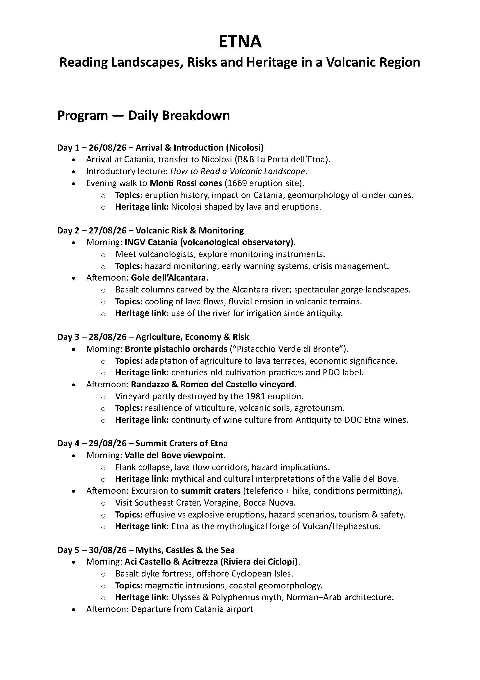 This 5-day in-the-field summer school explores Mt. Etna as a living laboratory where geology, heritage, and international policy converge. Participants will investigate volcanic landscapes and hazards, analyze how societies adapt and thrive in risky environments, and connect field observations to global frameworks of risk reduction, heritage protection, and sustainability.