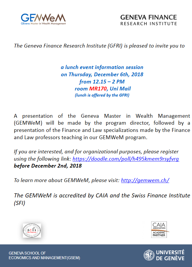The Geneva Financial Research Institute (GFRI) is pleased to invite you to the Master of Science in Wealth Management. GEMWeM, lunch event information sessions on Thurday, December 6th, 2018 from 12.15 - 2 pm, at room MR170.