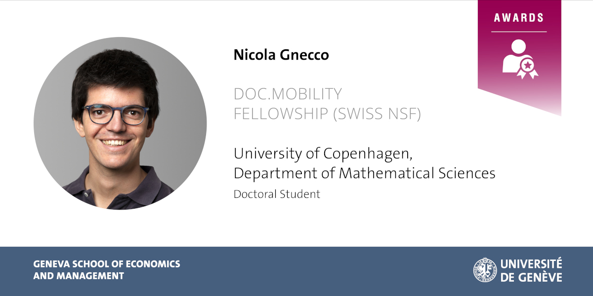Nicola Gnecco, Ph.D. Student and Teaching Assistant with the Research Center for Statistics, will stay at the Department of Mathematical Sciences of the University of Copenhagen (Denmark), as part of his doctoral studies.