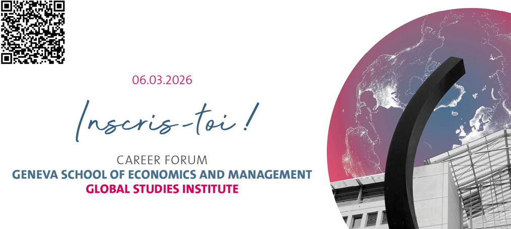 - The UNIGE Career Center is organizing the Careers Forum - International Relations, Economics and Management, a joint event for students and recent graduates of the Geneva School of Economics and Management and the Global Studies Institute. Numerous organizations and companies will be present, with information stands and presentations on projects, careers, and opportunities.