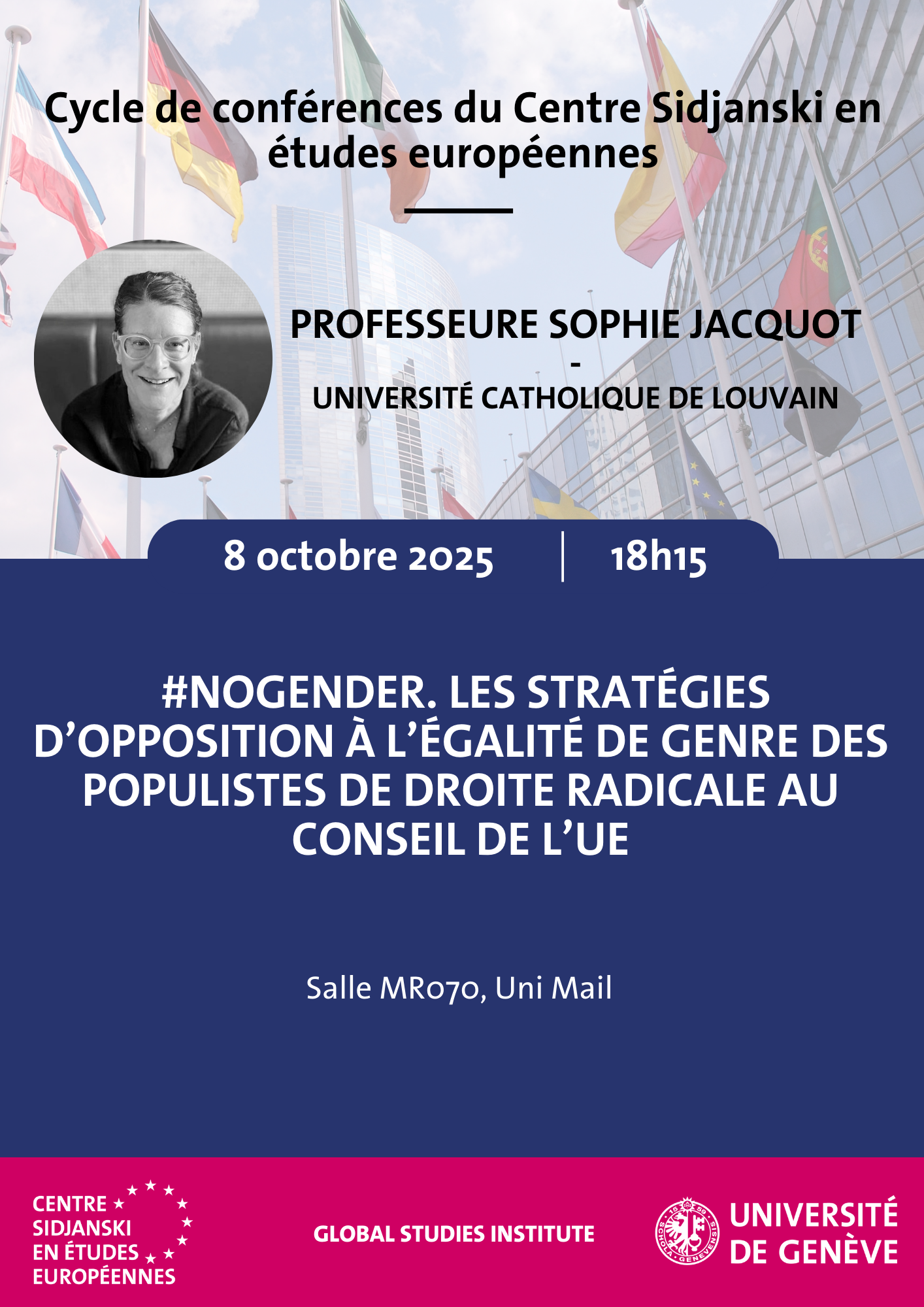 Pour sa deuxième conférence du semestre, le Centre Sidjanski à l'honneur d'accueillir la Professeure Sophie Jacquot de l'Université catholique de Louvain. Elle présentera les premiers résultats de son projet de recherche sur les stratégies d'opposition des populistes de droite radicale à l'égalité de genre au Conseil de l'UE, mené avec Laurie Beaudonnet de l'Université de Montréal.