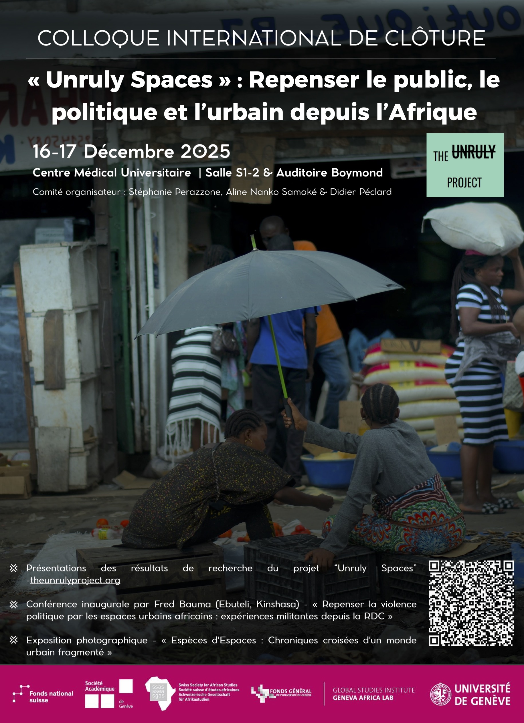 Le projet de recherche Unruly Spaces: Public Space, Society and Politics in Urban Africa, financé par le Fonds national suisse de la recherche scientifique (FNS) et dirigé par Stéphanie Perazzone, Professeure Assistante à l’Université de Glasgow et chercheuse associée au Global Studies Institute (GSI), arrive à son terme après trois années d’enquête collaborative entre Genève (Suisse), Glasgow (UK), Kinshasa (RDC) et Abidjan (Côte d’Ivoire). Hébergé au GSI, le projet explore – à la croisée de la science politique, de l’anthropologie et des études urbaines – les pratiques socio-spatiales, les imaginaires et les politiques de régulation et de contrôle (locales et globales) qui façonnent « l’espace public » urbain. À partir d’une approche comparative entre Abidjan et Kinshasa, il propose de repenser les effets empiriques et la signification conceptuelle de la frontière entre espaces publics et espaces privés.
