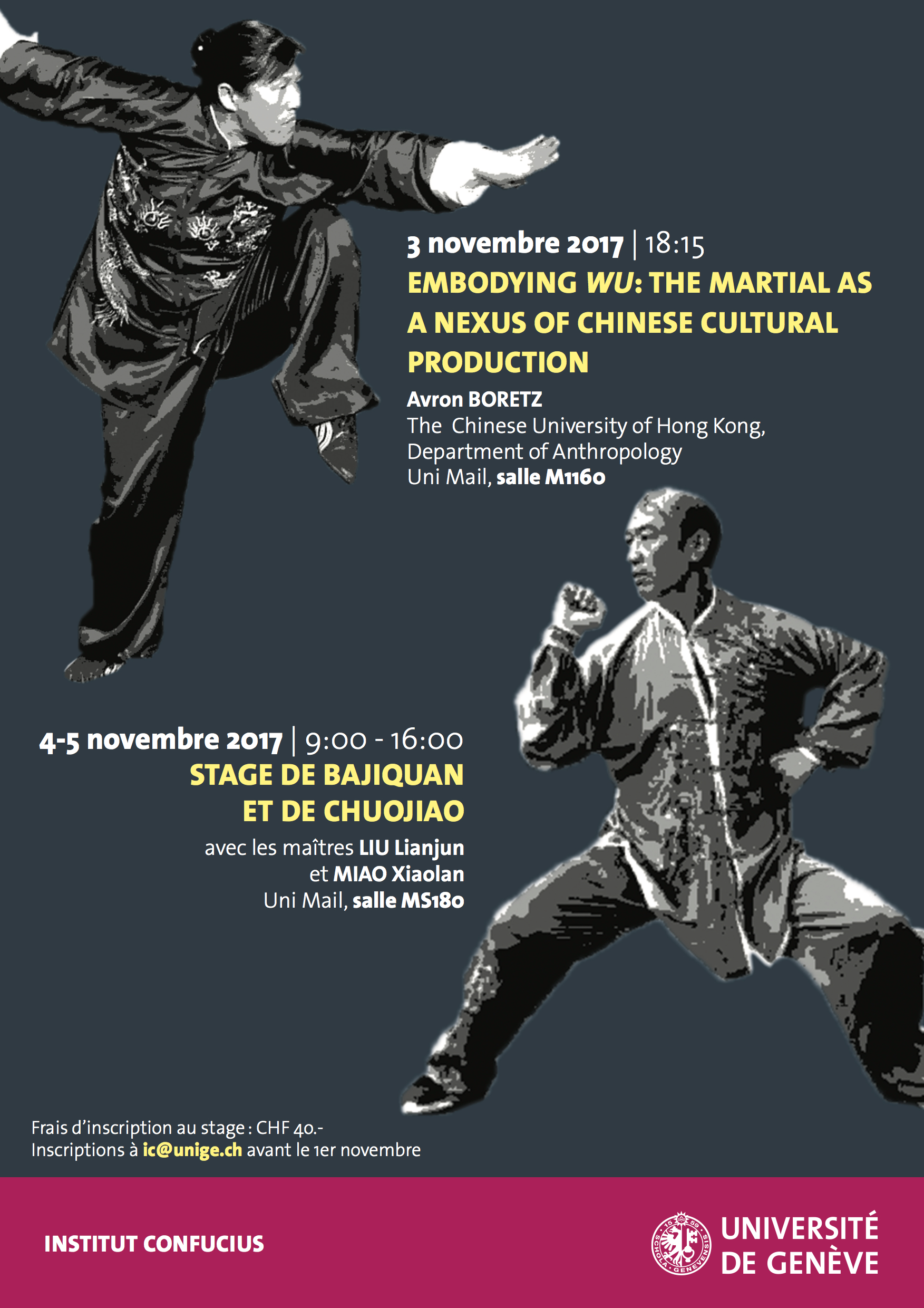 L'Institut Confucius de l'Université de Genève a le plaisir de vous inviter à une conférence et un atelier consacrés aux arts martiaux chinois (également connus sous le nom de wushu 武术) les 3, 4 et 5 novembre 2017.
