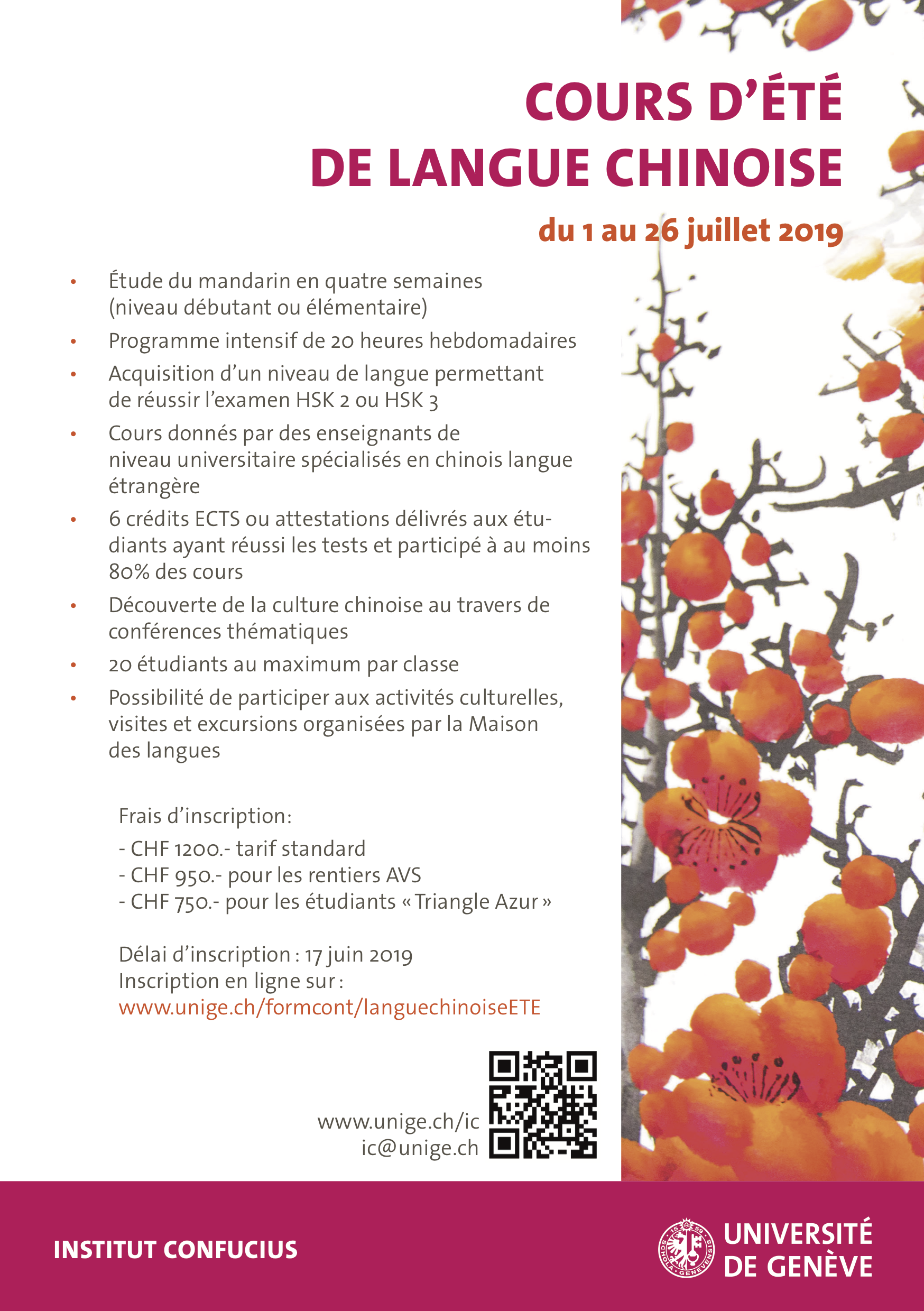 L’inscription se fait en ligne à l’adresse suivante : www.unige.ch/formcont/languechinoiseETE