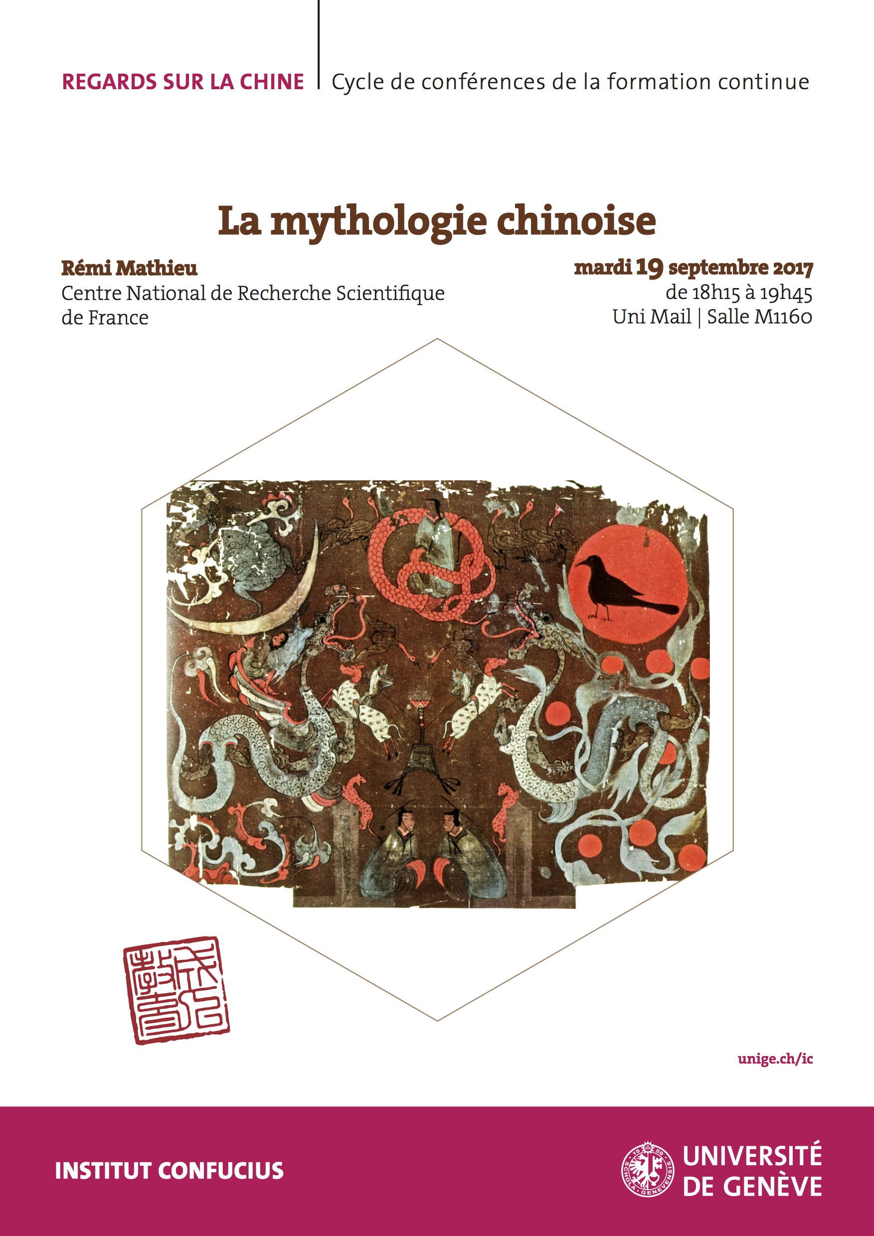 Le mardi 19 septembre 2017, l’Institut Confucius organise une conférence publique sur la mythologie chinoise, par M. Rémi Mathieu, directeur de recherche émérite au CNRS (Centre National de la Recherche Scientifique de France), qui a consacré ses travaux à l’étude de la philosophie, de la mythologie et de la littérature de la Chine ancienne.