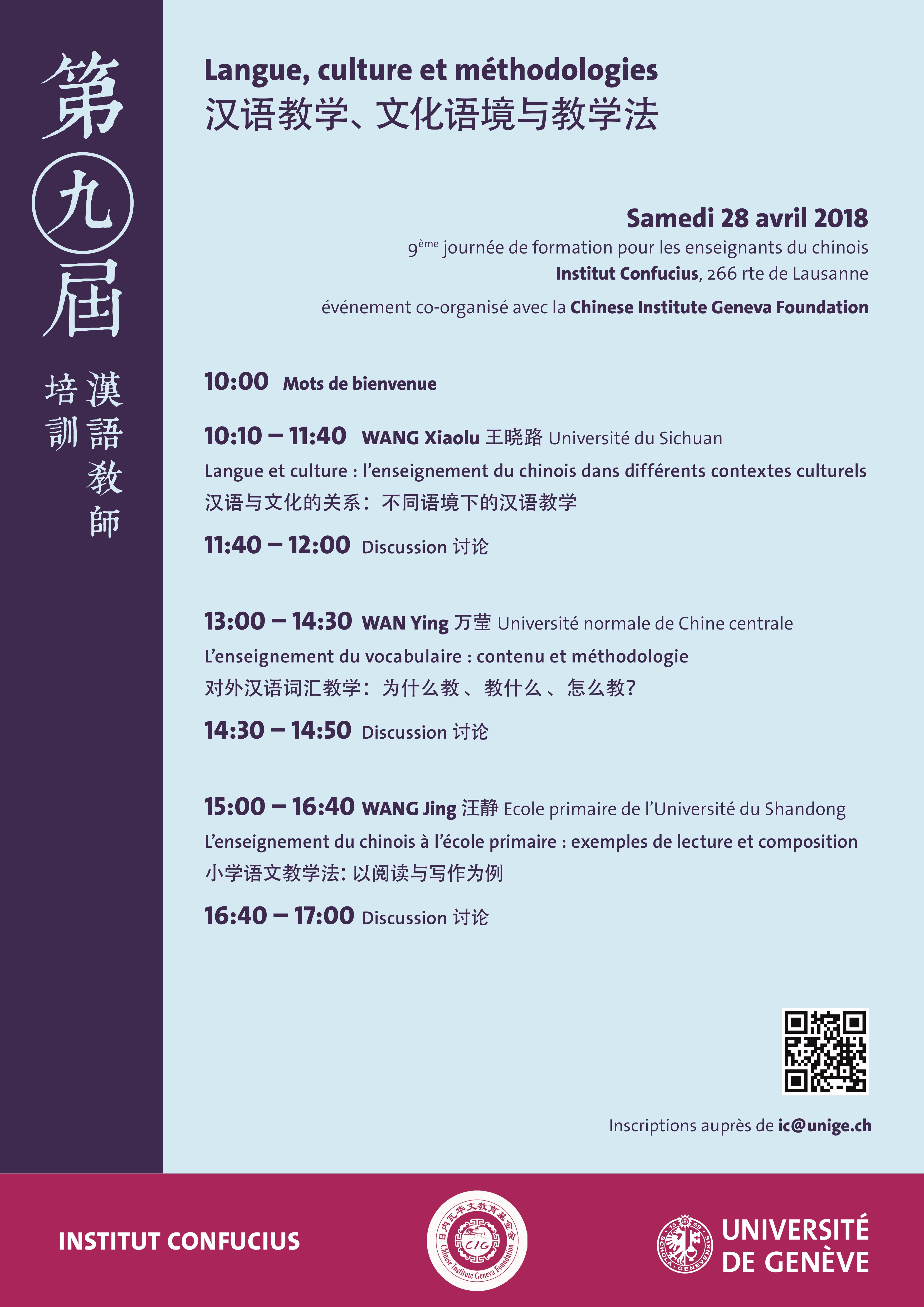 Le samedi 28 avril 2018, l’Institut Confucius et la Chinese Institute Geneva Foundation organisent la neuvième formation destinée aux enseignants du chinois langue étrangère, autour du thème « Langue, culture et méthodologies ».
