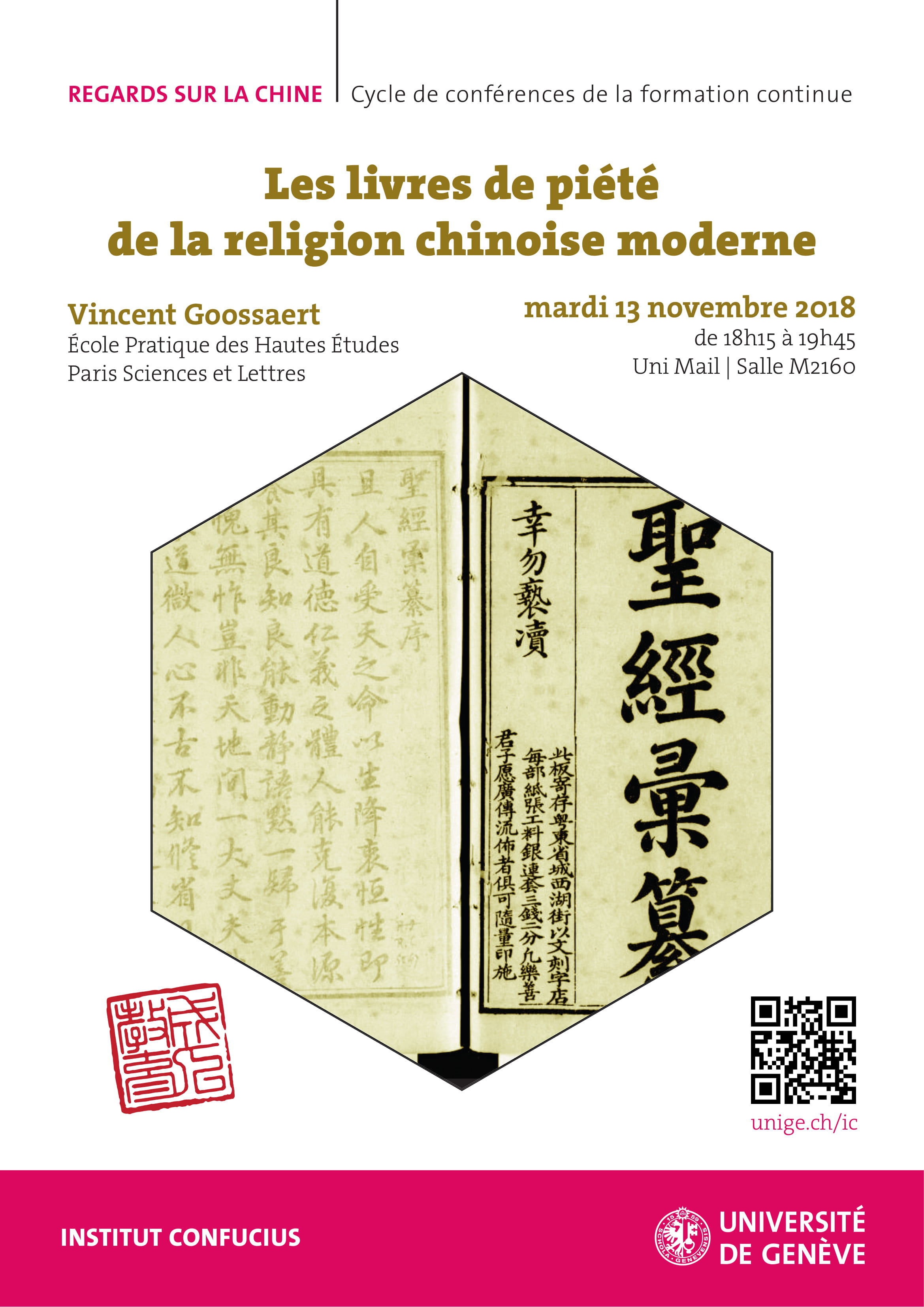 Le mardi 13 novembre 2018, l’Institut Confucius organise une conférence publique intitulée « Les livres de piété de la religion chinoise moderne » par M. Vincent Goossaert, directeur d’études à l’EPHE (Ecole Pratique des Hautes Etudes).
