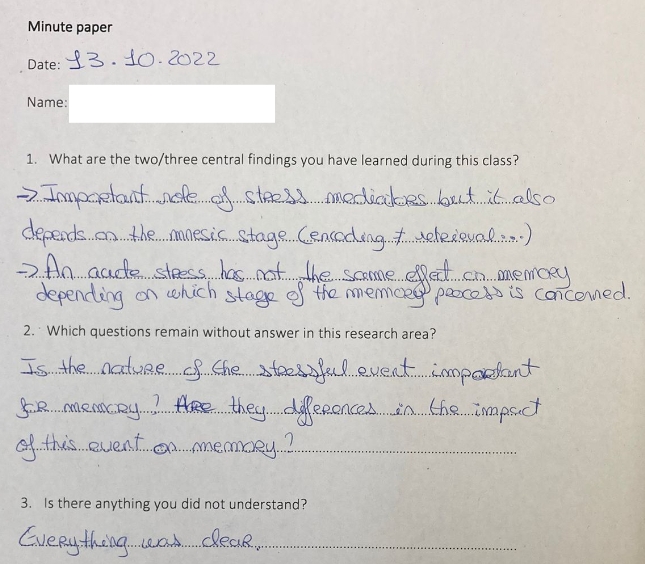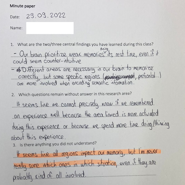 | Ulrike_Rimmele_Monika_Riegel.jpg | Apprentissage et mémoire | Learning and memory | Monika Riegel & Ulrike Rimmele | Université de Genève | FPSE | Responsabiliser | Développer des compétences | Moins de 25 | Les étudiant-es travaillent la matière du cours tout en appliquant les principes étudiés à travers les activités proposées (quiz, présentation d’article, discussion et modération, etc.), le rythme structuré des semaines et les modalités d’évaluation. Leur participation est active et les méthodes d’apprentissage utilisées leur permettent de développer un apprentissage sur le long terme et des compétences transversales. | Students work on the course material while applying the principles studied through the activities offered (quizzes, article presentations, discussion and moderation, etc.), the structured rhythm of the weeks and the assessment methods. Their participation is active, and the learning methods used enable them to develop long-term learning and cross-disciplinary skills. | 2022 | Apprentissage et mémoire | CIN | 01/08/2023 | https://www.unige.ch/innovations-pedagogiques/download_file/view/1620/1044 $$ Exemple de one minute paper https://www.unige.ch/innovations-pedagogiques/download_file/view/1619/1044 $$ Exemple de one minute paper https://www.unige.ch/innovations-pedagogiques/download_file/view/1621/1044 $$ Exemple de one minute paper |