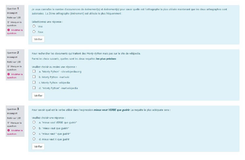 The InfoTrack platform is made up of 24 independent course modules divided into 5 themes: how to find, document research plan, sorting, plagiarism and writing & communication. All modules are structured on the same model: each unit includes a lecture in the form of a short video (3 to 5 min), a self-assessment quiz of 2 to 4 questions, a summary with the key elements of the lecture and sometimes additional resources. Each module can be followed independently of the others. No order of progression is imposed. In a self-training perspective, the learner can manage his or her progress thanks to a personal dashboard, which records his or her quiz results. If the system is used to complete a classroom training (before, during or after class), the modular structure allows trainers to select only the modules that correspond to the pedagogical objectives identified for a session or a group of learners. |