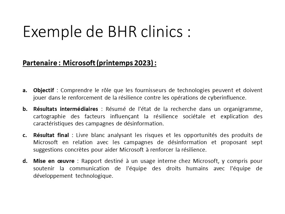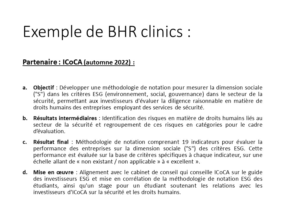L’équipe enseignante commence par faire circuler un appel à candidatures auprès d’entreprises ou d’organisation non gouvernementales en leur demandant de soumettre une ébauche de défi pour la BHR Clinic. L'étude de cas proposée doit être un enjeu réel lié aux droits humains dans le monde des affaires. Chaque candidature est évaluée par le comité du conseil consultatif du « Geneva Center for Business and Human Rights » (GCBHR). L'organisation sélectionnée est invitée à faire un don en faveur de la BHR Clinic. Parmi les partenaires précédents figurent Microsoft, Holcim et l’Association du Code de Conduite International (ICoCa). Une fois le projet sélectionné, il est présenté en début d’année académique aux étudiant-es qui peuvent alors demander à y participer. Ces projets (« Cliniques ») sont présentés dans le cadre du cours « projet institutionnel » qui, en tant que cours à option, contribue à hauteur de 6 ECTS au master, pris en compte pour la spécialisation en « Sustainable Business and Human Rights ». L'équipe enseignante sélectionne sept à dix étudiants, sur la base de leur lettre de motivation et d'un entretien, pour former l'équipe de projet qui travaille sur le défi proposé par le partenaire. Chaque semaine, les enseignants organisent un séminaire pour discuter en groupe de la méthodologie de recherche, des méthodes de gestion de projet et de leurs progrès pratiques. Des ateliers sont également organisés avec le partenaire à des moments clés dans le développement du projet. En dehors de ces phases « formelles », les étudiant-es sont libres de choisir leurs propres outils de communication et de suivi du projet. Tout au long du semestre, ils/elles communiquent à la fois avec les superviseurs et avec l'organisation pour mener des entretiens, préparer leurs recherches et présenter leurs résultats. Le projet est globalement divisé en deux phases : une phase de recherche et une phase d'application. Les étudiant-es travaillant sur un défi réel et actuel, la « Clinique » est un processus de co-création.