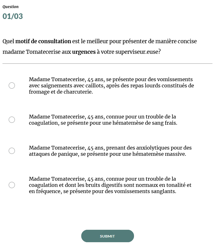 Oral case presentation is an essential communication technique in medicine. It is used every day by all medical staff. Patient care depends in part on the effective transmission of the case between different members of the medical staff. However, this skill is little theorized, and little explained to students. When they arrive at their internship, students often feel helpless and ill-equipped. Based on this observation and their own experience, two medical students have created an e-learning tool that provides students with autonomous and progressive support. |