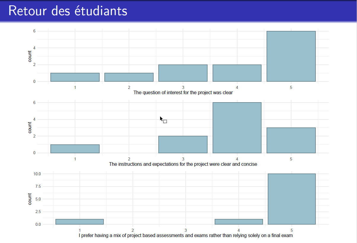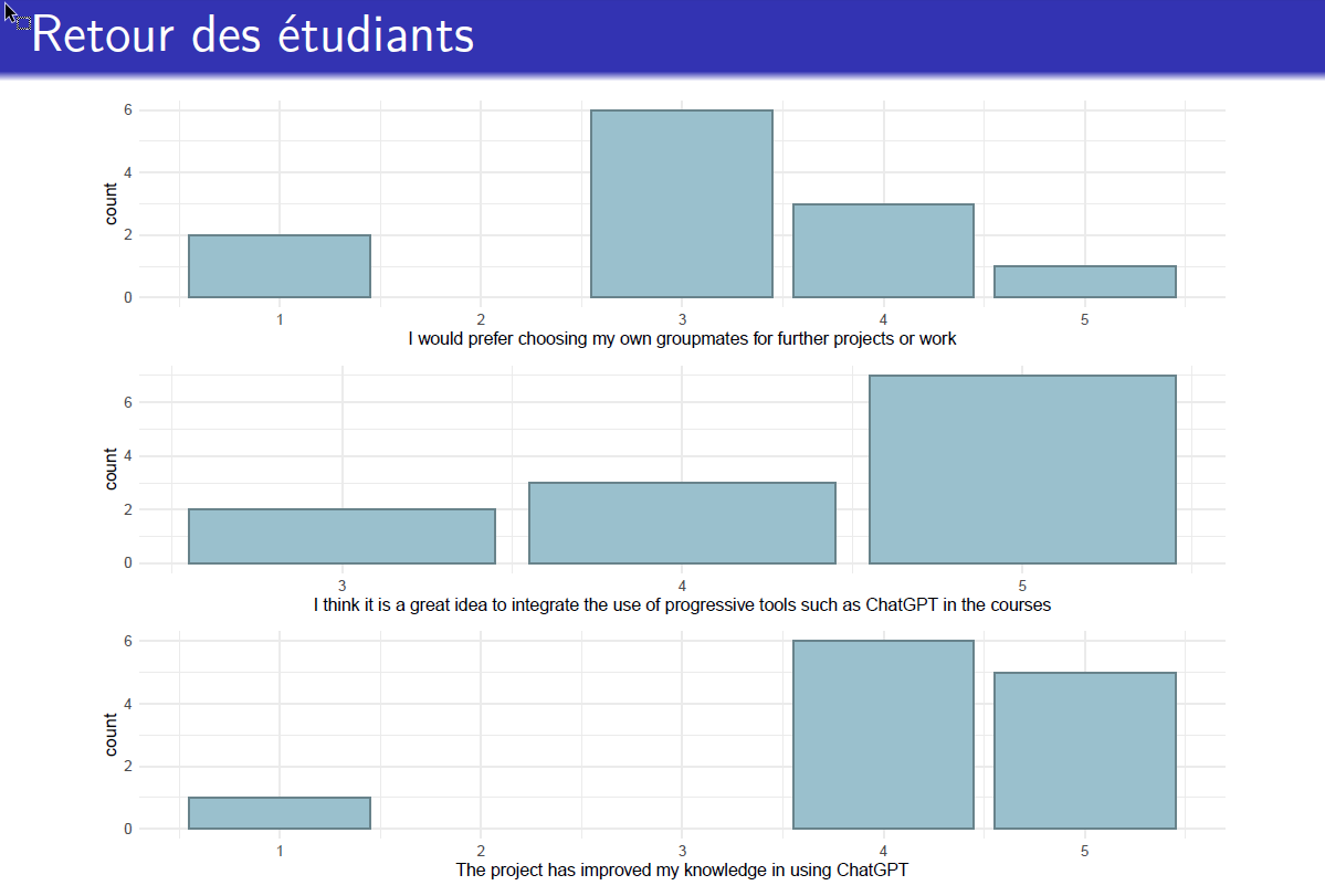 This project arose from a questioning of the impact of generative artificial intelligence tools, such as ChatGPT, on pedagogical and professional statistical practices. The course content has not changed, but the emergence of these new tools has prompted a twofold reflection. On the one hand, on the necessary evolution of teaching methods in the face of these technologies, and on the other, on the way in which the profession of statistician could be led to integrate, or even depend on, such digital assistance. The desire to confront students with these transformations within a defined framework therefore became a priority. This reflection has taken place in an institutional context open to experimentation, where the use of AI is not forbidden, but remains little regulated. The course in question, taught as part of the Master's degree in Statistics, lends itself particularly well to this type of exploration, as students already have a solid grounding in modeling and data analysis. The introduction of ChatGPT in an analysis project therefore enabled us to explore in concrete terms how AI could intervene in the statistical processing chain, while assessing its contributions and limitations. |