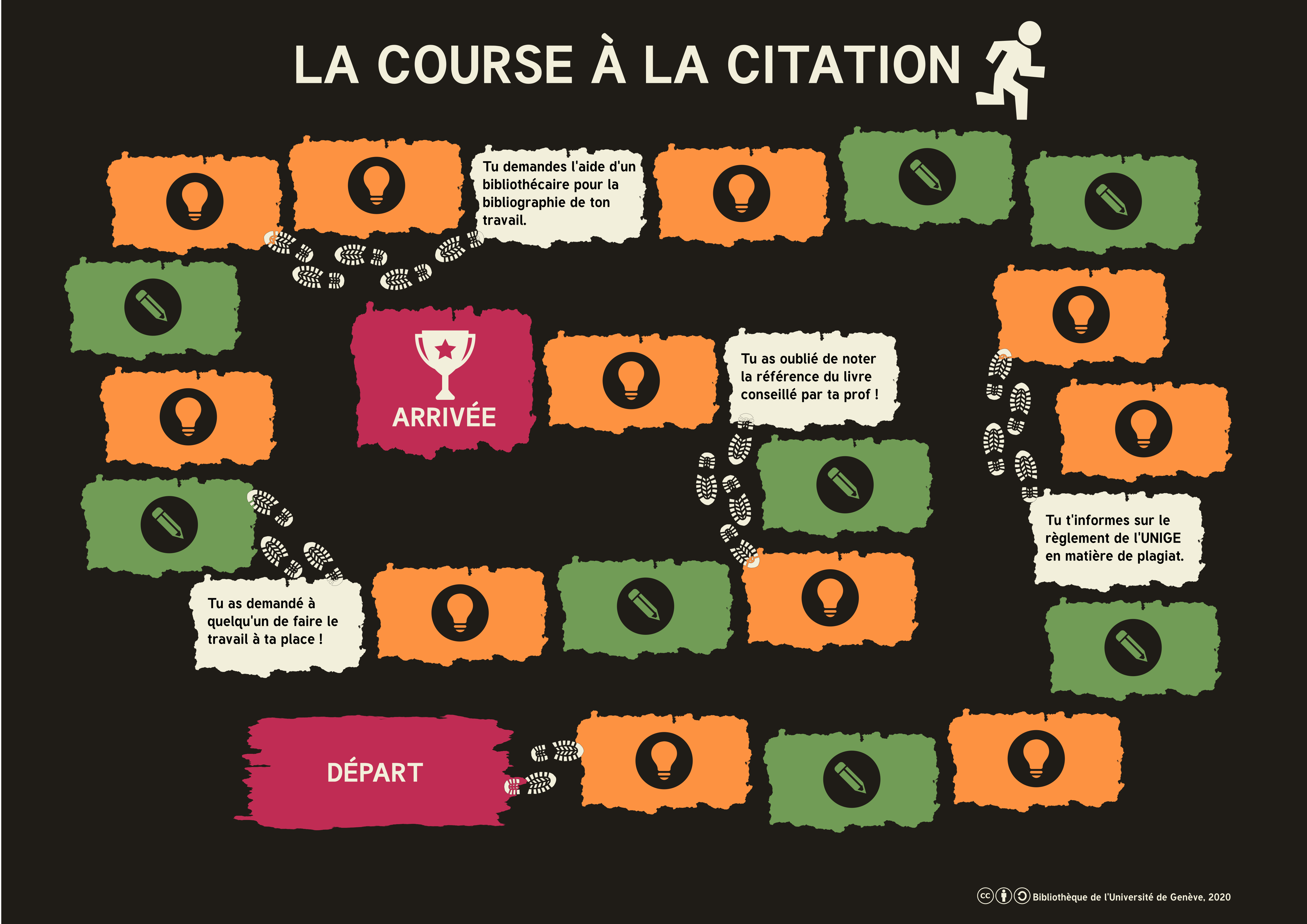 | Laure Mellifluo_Course_citation_plateau jeu.png | La course à la citation | La course à la citation | Bibliothèque de l’Université de Genève | Université de Genève | Transversal | Rendre actifs | Faire collaborer | 25 - 50 | « La Course à la citation » est un jeu de plateau qui sensibilise les étudiant-es aux bonnes pratiques de citation et au risque de plagiat. Pour progresser dans le jeu, les joueur/euses doivent répondre correctement à des questions de type « vrai/faux » ou « à choix multiple ». | "La Course à la citation" is a board game that raises students' awareness of good citation practices and the risk of plagiarism. To progress through the game, players have to answer "true/false" or "multiple choice" questions correctly. | 2017 | La course à la citation | 01/08/2023 | |||