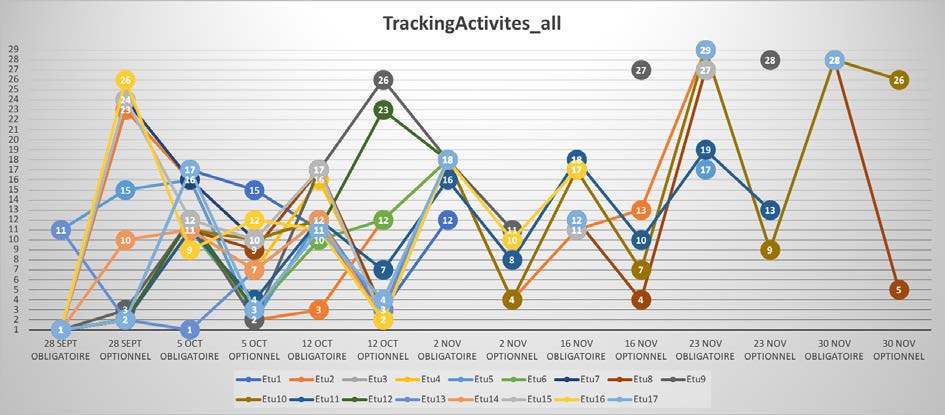 Du côté de l’équipe enseignante, la plateforme permet de suivre les parcours individuels de chaque étudiant-e. Un système d’email et de paramétrage des notifications est intégré à l’outil. L’équipe enseignante peut donc directement contacter l’étudiant-e sur une activité donnée et sur une tâche spécifique. L’équipe enseignante donne chaque semaine un feedback détaillé à chaque activité ainsi qu’une note aux activités obligatoires. Elle reste alerte et motivée car ce format signifie qu’une variation d’évaluations et de feedbacks sont à réaliser chaque semaine.
