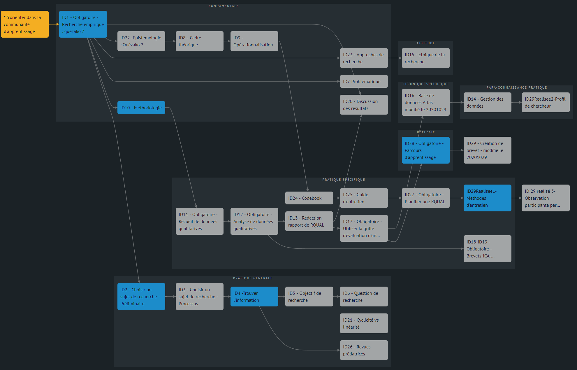 L’équipe enseignante a utilisé Moodle en complément de Sqily pour l’organisation et le suivi des activités. Moodle n’a été utilisé que pour la partie réglementaire du cours, notamment les notes. Les activités sont regroupées par catégorie (compétences techniques, connaissances fondamentales, etc.) et représentées visuellement sous forme d’une arborescence. Les étudiant-es ont donc une vision complète des activités de recherche, de leurs liens et peuvent choisir, semaine après semaine, celles qu’ils souhaitent réaliser. Une trentaine d’activités ont été conçues et représentées visuellement pour permettre aux apprenant-es de commencer par l’activité qui leur convient le mieux et d’organiser leur parcours d’apprentissage de manière cohérente. Parmi la trentaine d’activité, 8 sont obligatoires et touchent aux compétences et connaissances cœurs, les autres sont optionnelles.