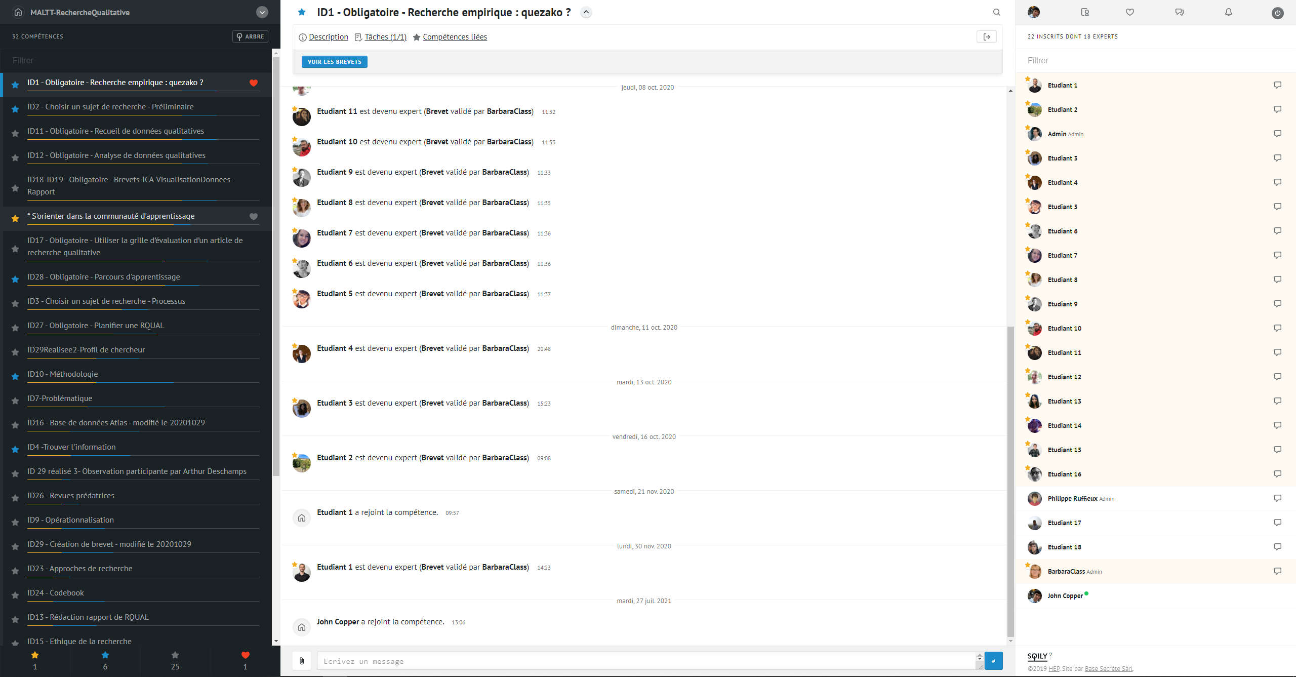 Bien que le cours puisse se faire sur Moodle, l’équipe enseignante a privilégié l’outil Sqily pour les valeurs pédagogiques qu’il véhicule : arbres de connaissance et enseignement mutuel. Le premier permet de visualiser en un coup d’œil les différentes trajectoires possibles et le second soutient l’apprentissage social au sein d’un groupe.