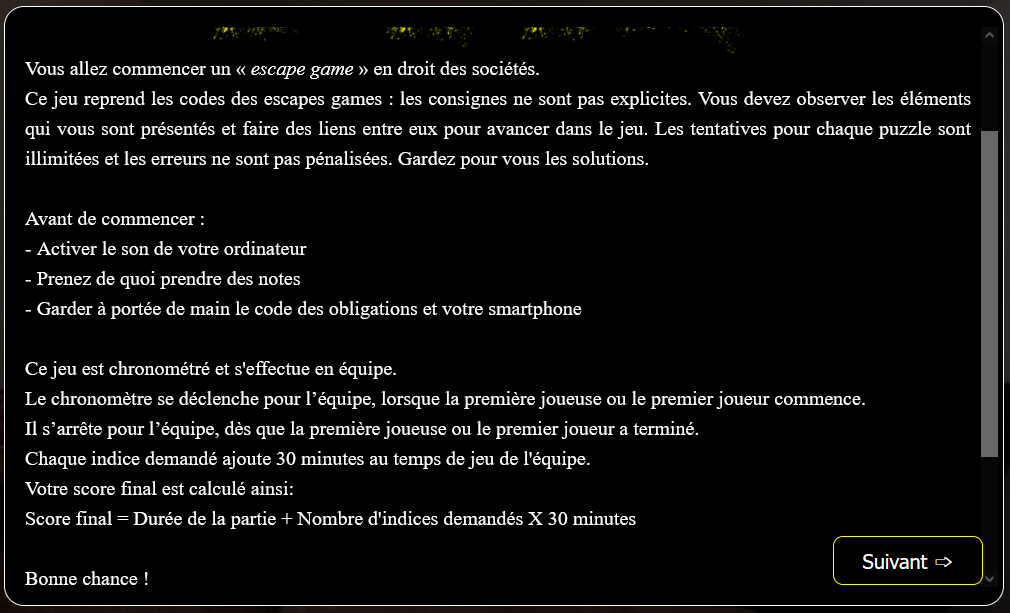 Escape the firm" is based on the codes of a classic escape game. The instructions are not explicit. The students - who are encouraged to play in teams - have to explore the game and work out what they have to do to progress in the adventure.