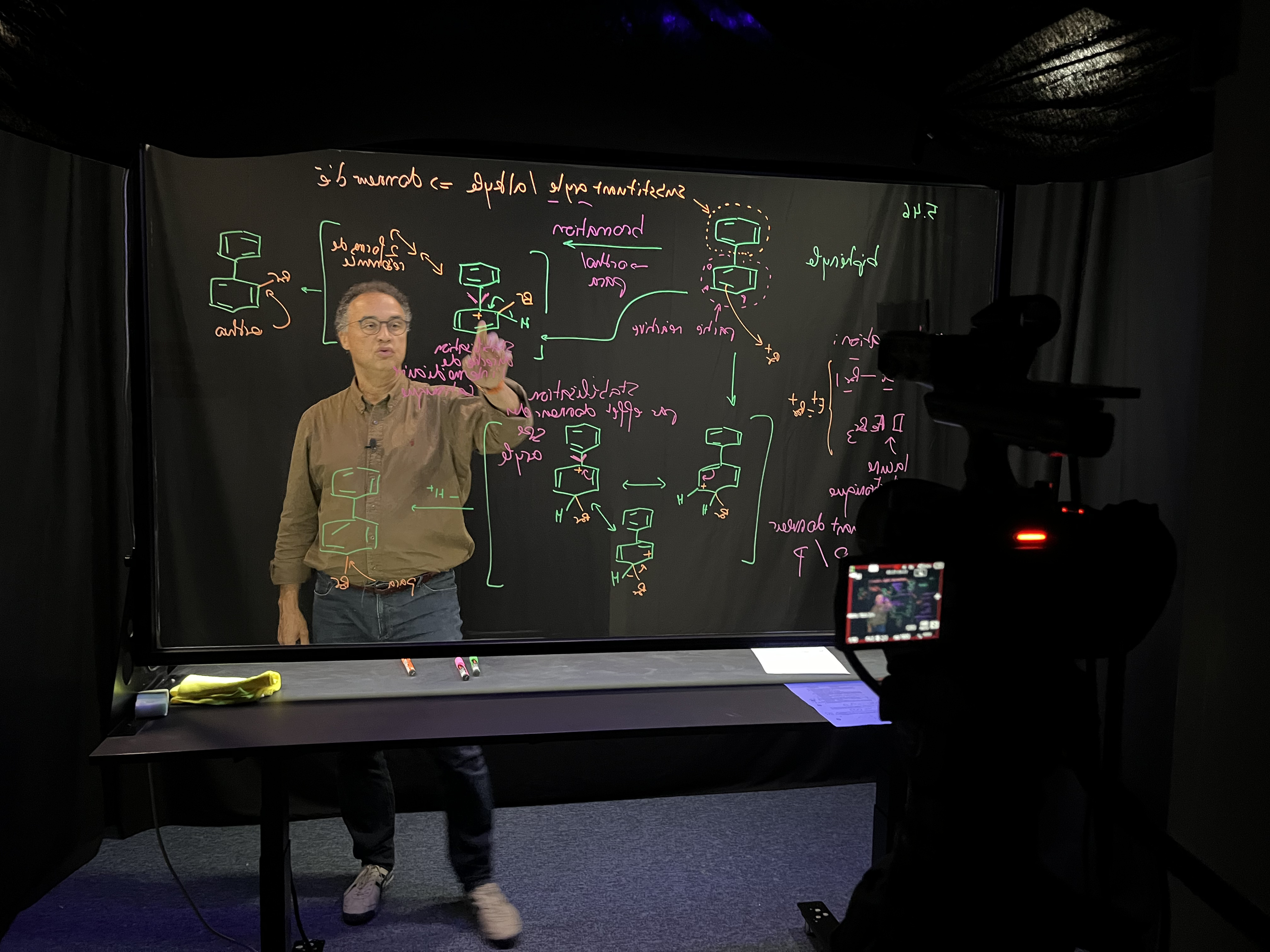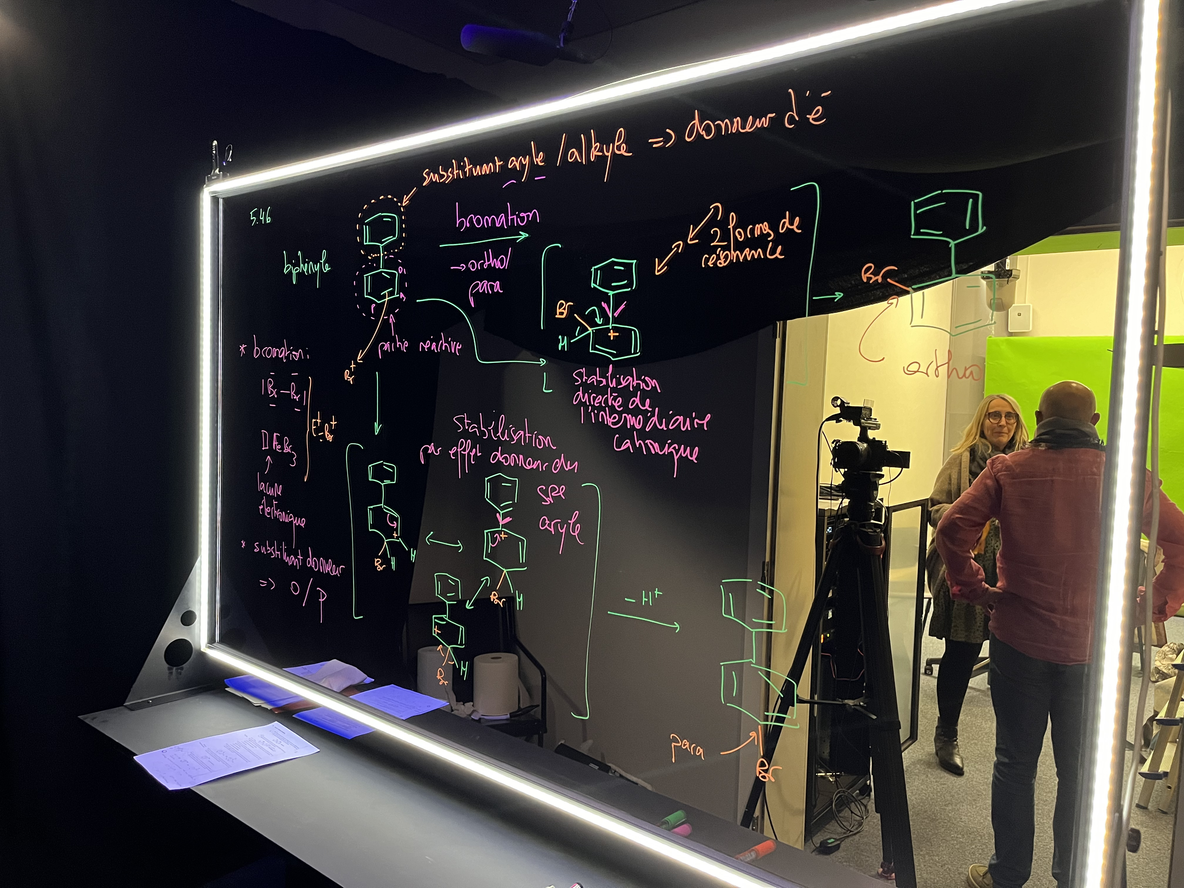Each week, the teacher corrects four to five selected exercises, in the form of short videos lasting around five minutes. These videos are produced using a lightboard, a backlit transparent glass board. Thanks to this device, the teacher can write on the board with fluorescent markers while still facing the camera, thus offering an oral and visual explanation. The image is then digitally inverted so that the text appears legible to the students. These short videos follow a structured, progressive method: identification of the problem, reminder of the associated theoretical concepts, presentation of the scientific problem and progressive resolution of the exercise.