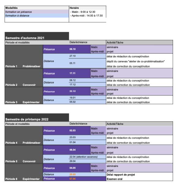En présence, des séminaires dispensent des apports conceptuels aux étudiant-es. Des méthodes de conduite de la recherche sur les technologies éducatives sont discutées à partir de présentations, de lectures et d’activités de groupes. À distance, les étudiant-es doivent mettre en application leurs nouvelles connaissances en élaborant un projet de recherche et un lexique collaboratif.