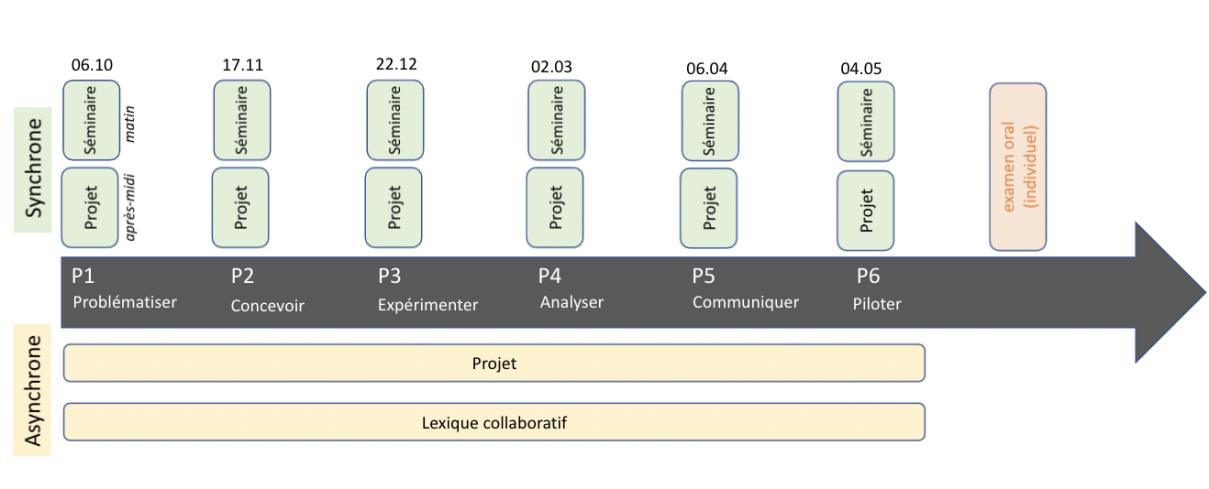 Le cours comprend 6 périodes de 4 semaines traitant chacune d’une thématique spécifique. Chaque thématique abordée débouche sur un travail écrit rédigé par les étudiant-es. Chaque période est caractérisée par l’alternance entre du travail synchrone (en présence) et asynchrone (à distance).