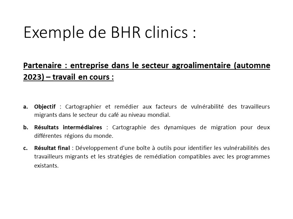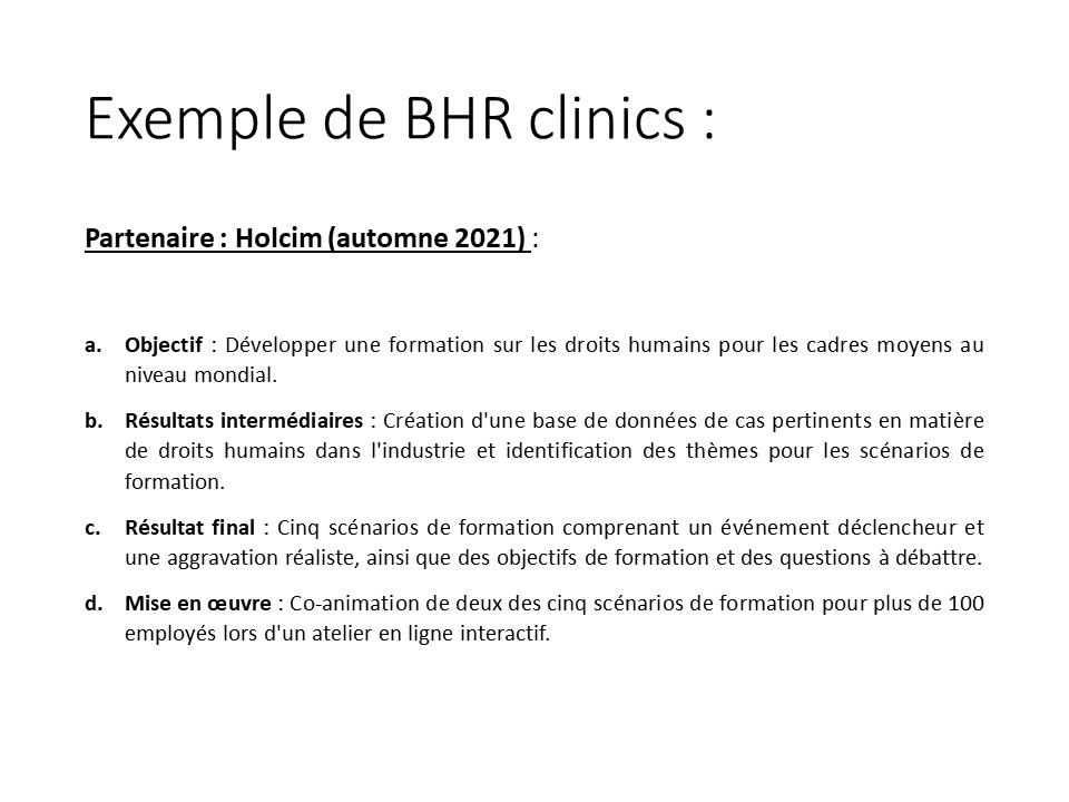 The teaching team begins by circulating a call for applications to companies or non-governmental organizations, asking them to submit a draft challenge for the BHR Clinic. The proposed case study must be a real issue relating to human rights in the business world. Each application is assessed by the Advisory Board of the Geneva Center for Business and Human Rights (GCBHR). The selected organisation is invited to make a donation to the BHR Clinic. Previous partners include Microsoft, Holcim and the International Code of Conduct Association (ICoCa).