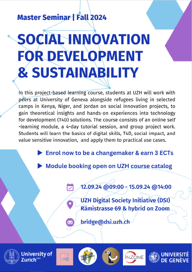 As the first milestone, HOPE will release its project-based learning course on the topic Social Innovation for Development and Sustainability in fall 2024. The course is designed to bring together students from University of Zurich and University of Geneva, alongside refugee learners living in camps in Kenya, Niger and Jordan, to co-create technology for development (T4D) solutions for real-world challenges, during a 4-day tutorial session in a hybrid format.