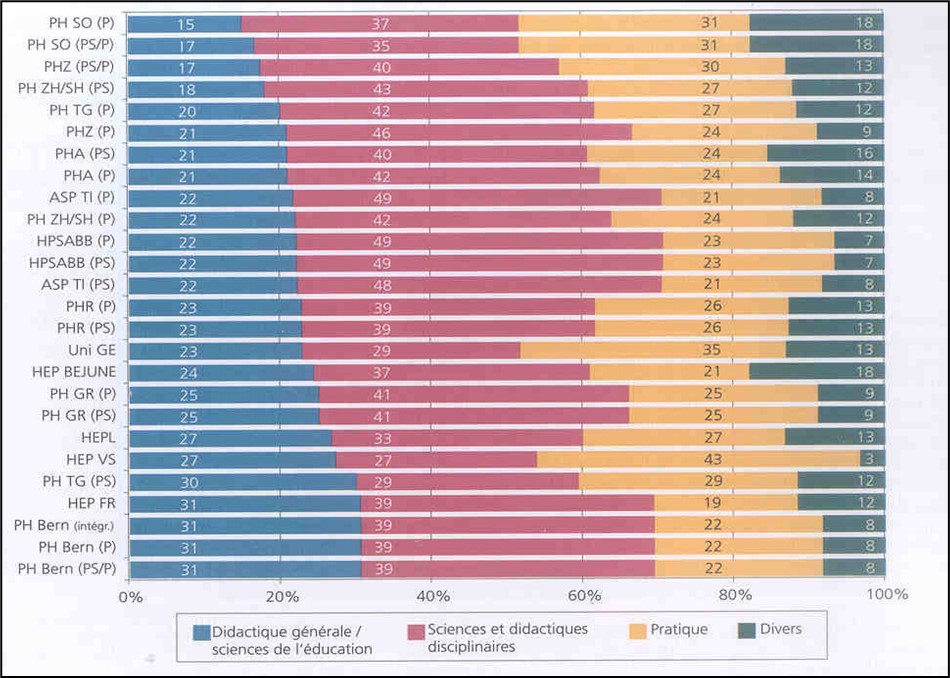 * Proportion de la formation pratique dans les différentes Hautes écoles (Lehmann, L., Criblez, L., Guldimann, T., Fuchs, W. & Périsset Bagnoud, D. (2007). Les formations à l'enseignement en Suisse : rapport dans le cadre du monitorage de l'éducation 2006. Aarau : Centre suisse pour la recherche en éducation.)